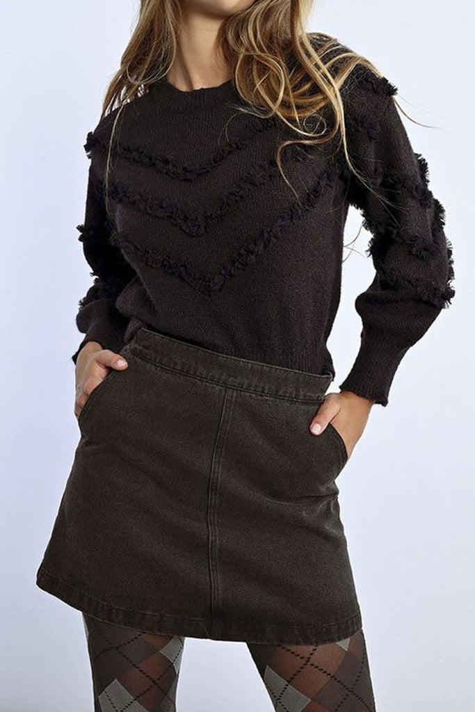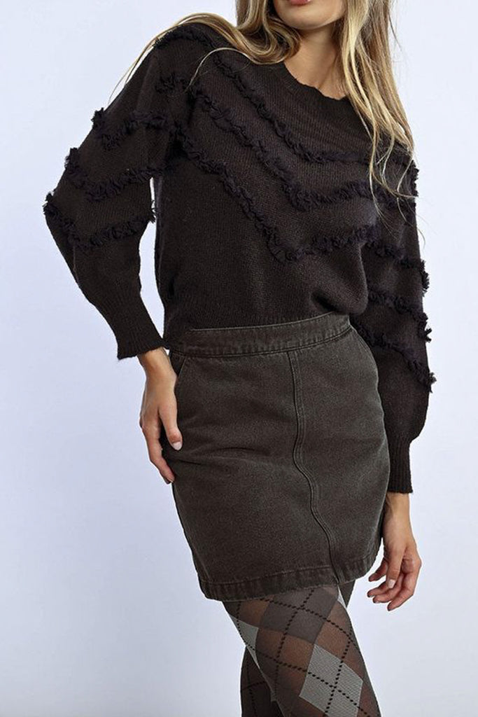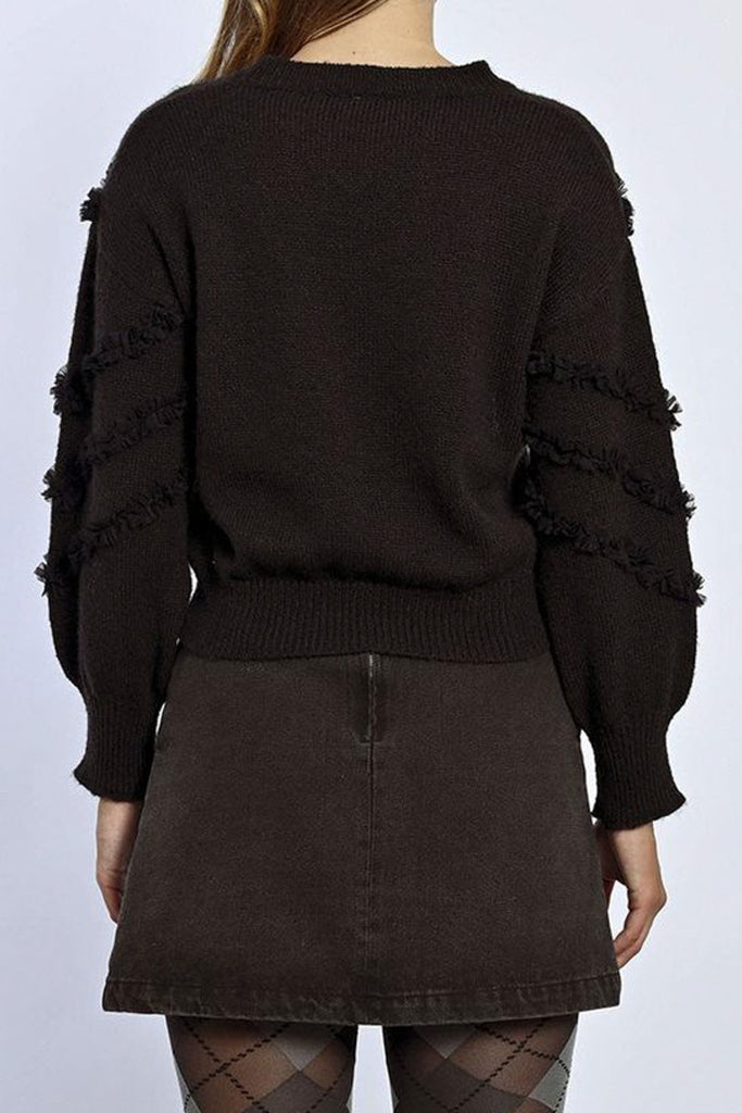 Personify Shopcute black sweater with unique tulle trim details on front. trim has a ruffled tulle chevron design on front of sweater, giving sleeves a striped look. raglan sweater features a classic crew neckline, roomy long sleeves, and ribbed wrist cuffs and bottom hemline. sweater can be dressed up with a skirt or worn casually with jeans.
