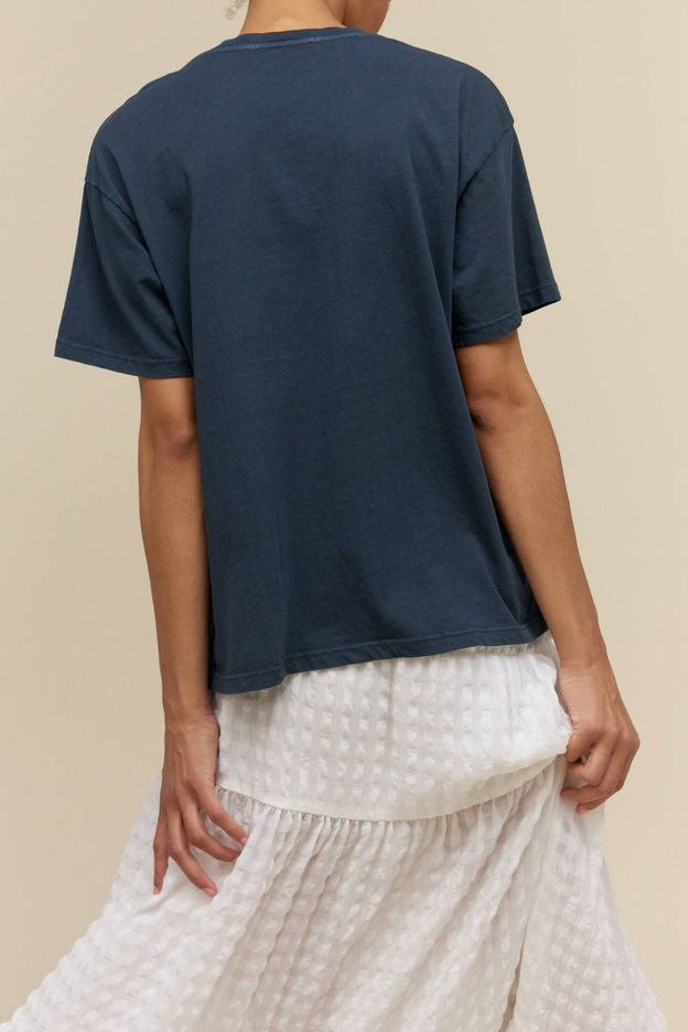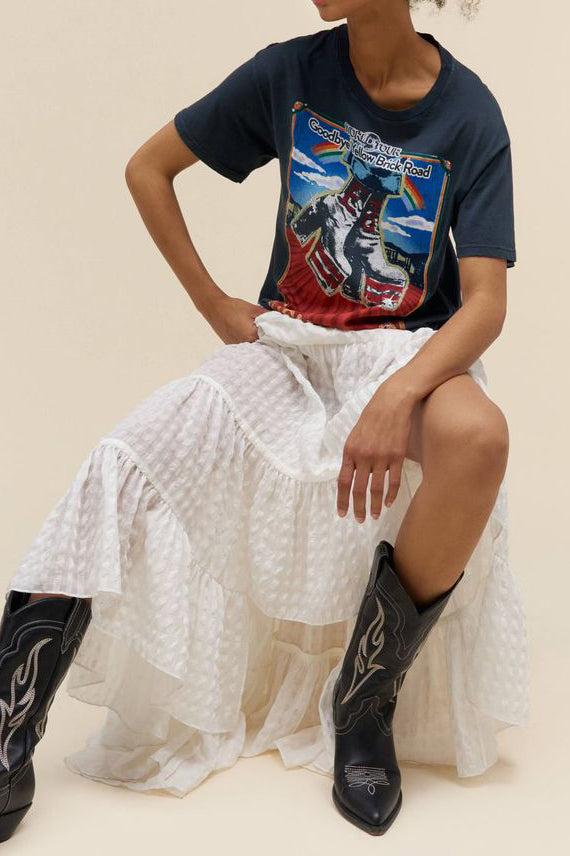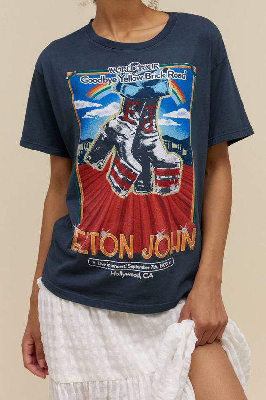 Personify Shopdaydreamer washed black boyfriend tee celebrating the glamour of sir elton john. paying homage to john's goodbye yellow brick road hollywood bowl concert, tee has a poster style, multi-colored graphic featuring elton’s distinctive platform boots and initials. special tee is accented with a few added twinkles and silver glitter. boyfriend tee has a slouchy fit with a classic length and comes in an airy, lightweight cotton.