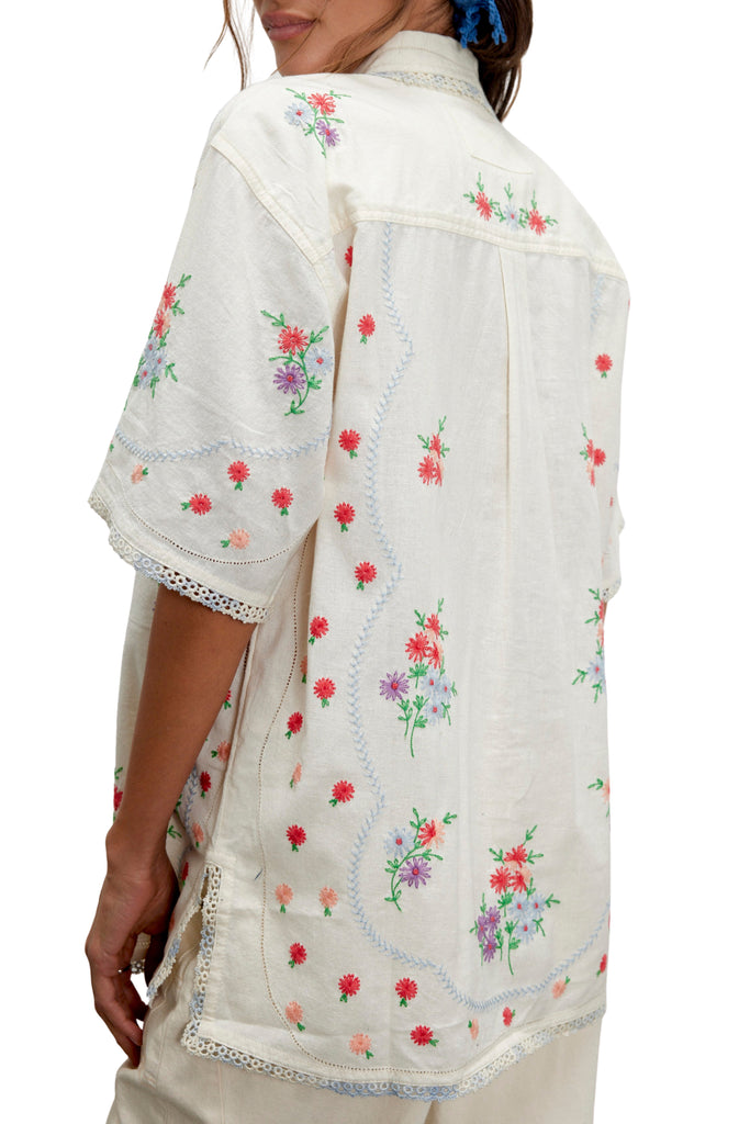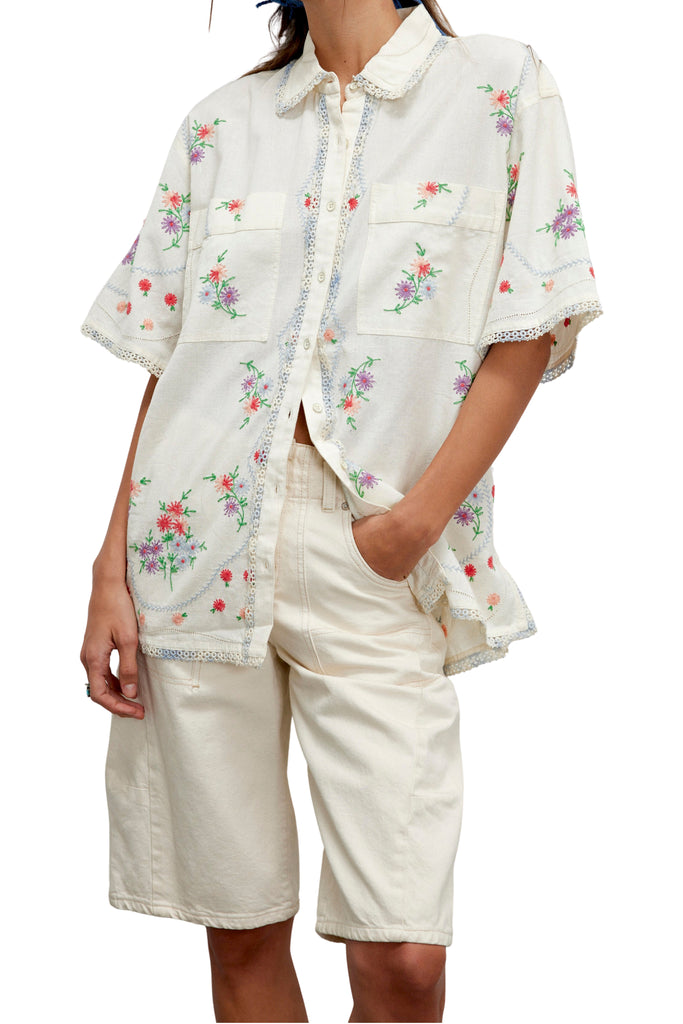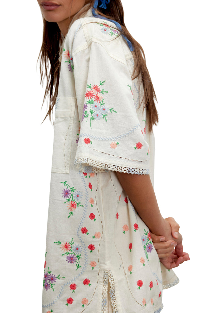 free people easy and effortless button down with beautifully embroidered details throughout. lightweight cotton-linen top has a relaxed, oversized fit and features a collared neckline, button-front closure, patch chest pockets, dropped shoulder short sleeves, gorgeous floral embroidery, and intricate trim. sweet and darling top looks great with jeans, shorts, or thrown over your swimsuit.