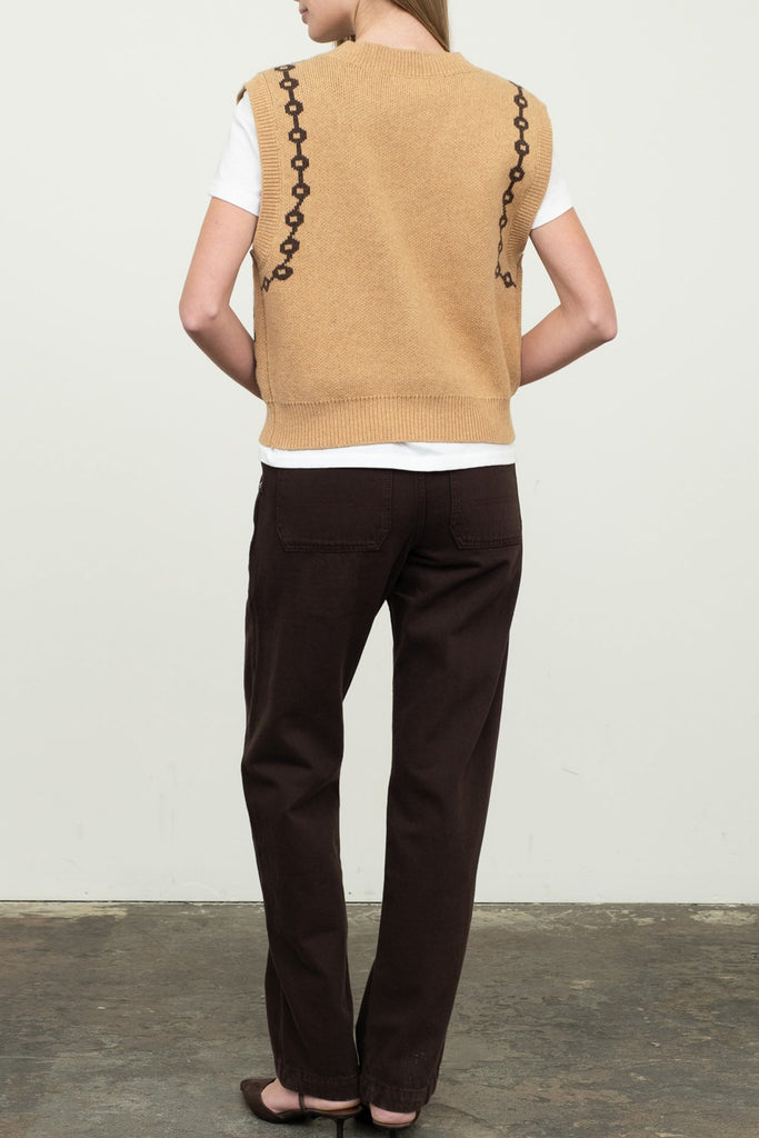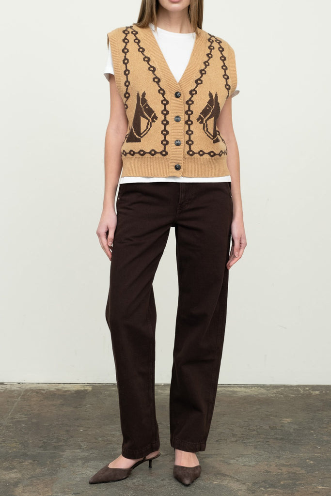 western-inspired jacquard knit vest in camel and chocolate brown. vest has a relaxed, boxy fit and features a v neckline, button front, and beautifully knit details, like horse silhouettes and a patterned trim on front and back. versatile sweater vest can be styled many different ways.