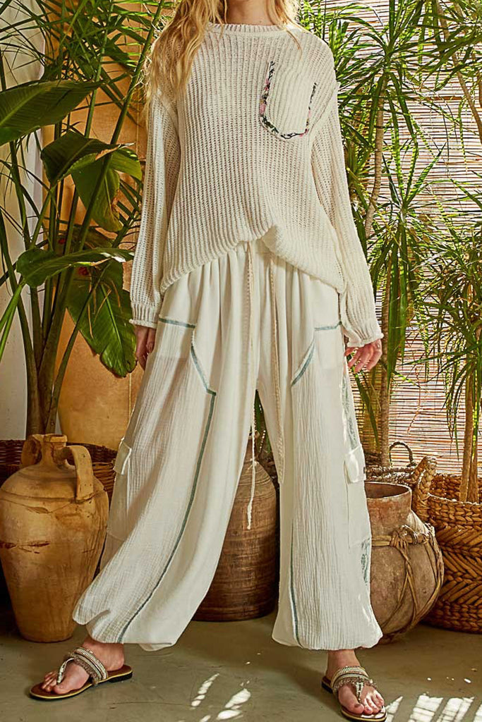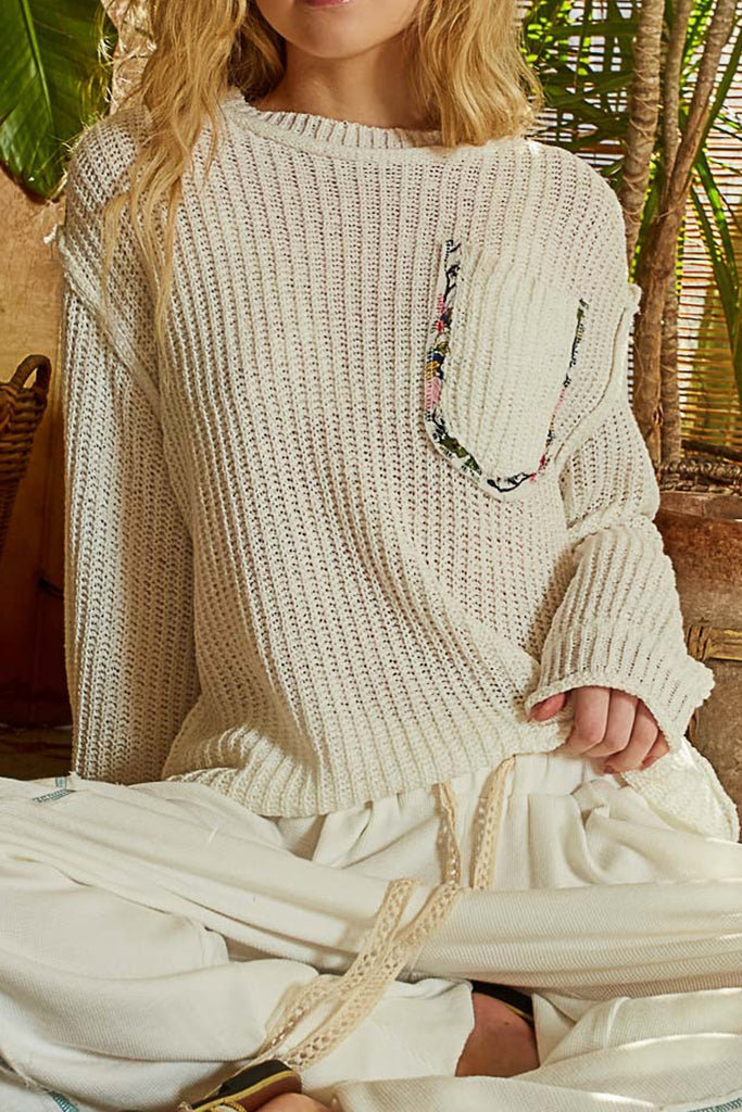 lightweight ivory knit sweater with a loose, slightly oversized fit. soft sweater has a more open knit texture and features a crew neckline, dropped shoulders, front pocket with pretty floral details, roomy long sleeves, and exposed seam details throughout. easy to wear sweater has a slouchy vibe that is perfect for a beach vacation or everyday casual wear.