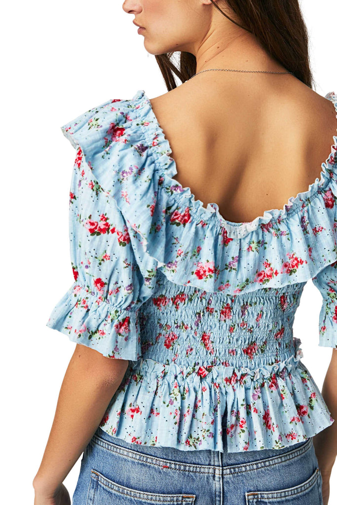 Personify Shopfree people flirty and feminine top in lovely blue floral pattern. timeless top features a cross-front design, exaggerated ruffle detailing, and a smocked bodice for a flattering, close-to-the-body fit. effortless top is the perfect vintage-inspired staple to add to your wardrobe this spring.