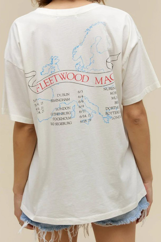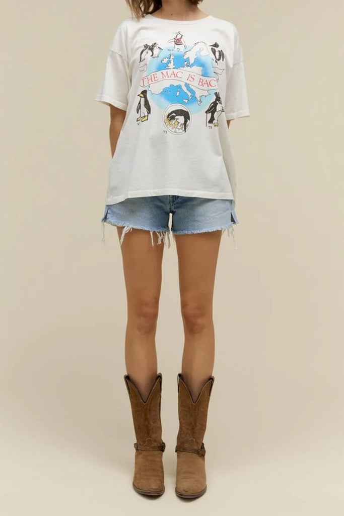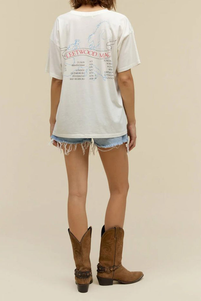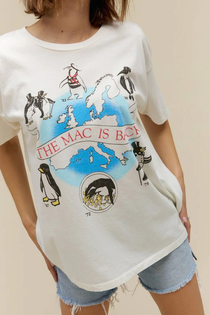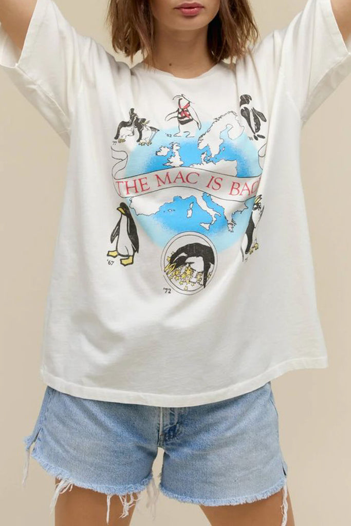 Personify Shopdaydreamer merch tee celebrating rock legends fleetwood mac! fresh feeling white tee features cute penguin graphics commemorating influential years for the band. back of tee is stamped with dates and locations of hit shows from around the world. oversized tee is cute and fun for the summer! merch tee is a mix between daydreamer's one size t-shirt and weekender tee, made to fit you like a perfect vintage find.