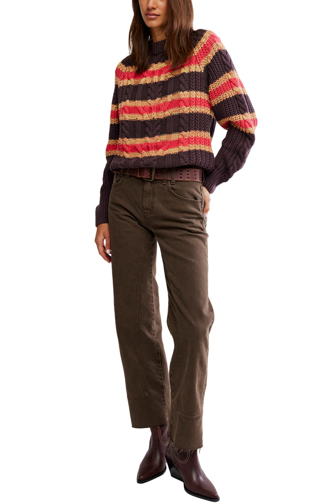 Personify Shopfree people chunky knit sweater in chocolate brown, golden yellow, and bold red stripes. cotton sweater has a cropped, boxy silhouette and features a crew neckline, dropped shoulders, roomy long sleeves, ribbed trim, and beautifully knit cable details throughout. sweater makes a cozy, comfortable layer to wear this fall and into the winter.