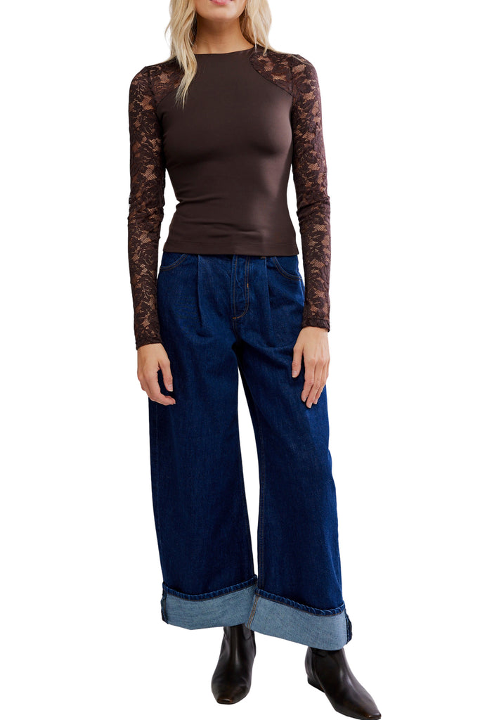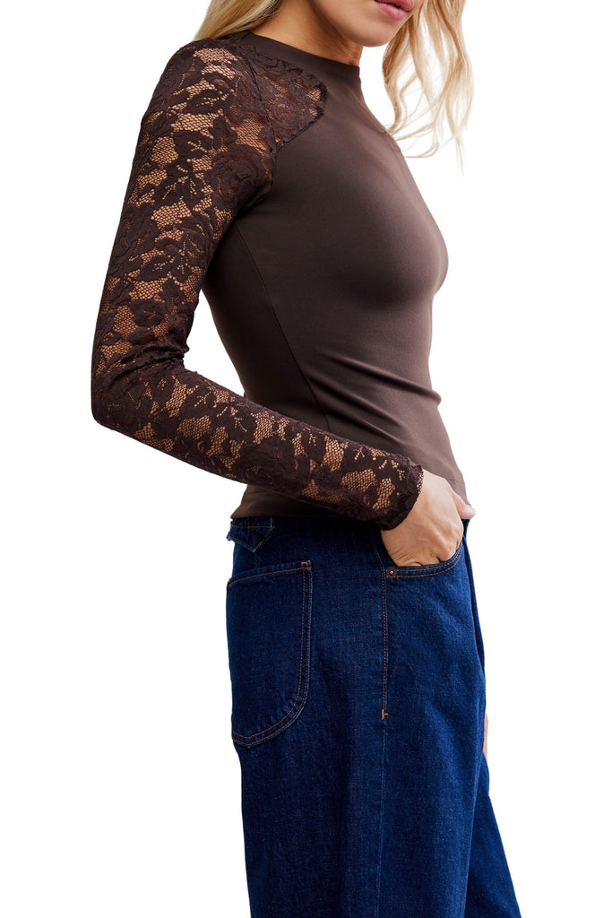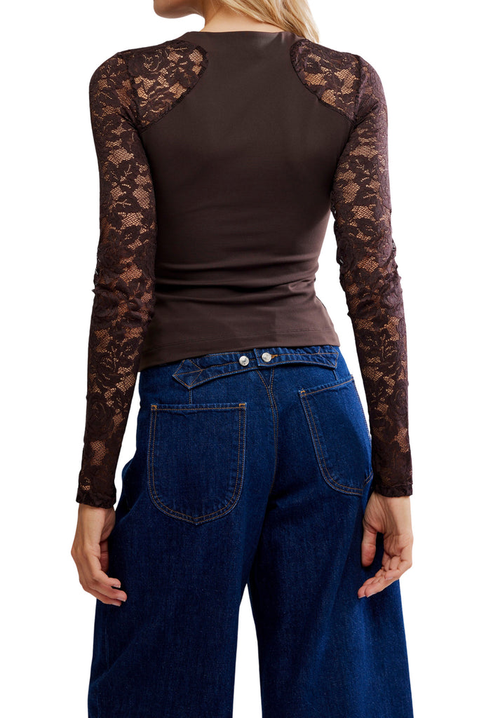Personify Shopfree people form-fitting tee in chocolate brown. stretchy top features a crew neckline and lace on sleeves and shoulders. top is form-fitting like a bodysuit and looks great paired with a skirt, overalls, a jumpsuit, or your favorite jeans.