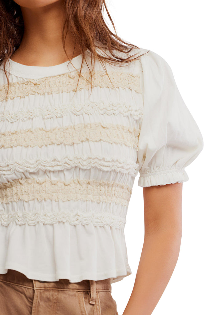 Personify Shopfree people romantic feeling peplum top in versatile ivory. stretchy top has a fitted and cropped silhouette and features a soft cotton knit fabrication, crew neckline, puffed short sleeves, a smocked bodice with lace inlays and ruffles, and peplum-style ruffled bottom hem. easy to wear top goes with everything and will add some texture and intrigue to any outfit.