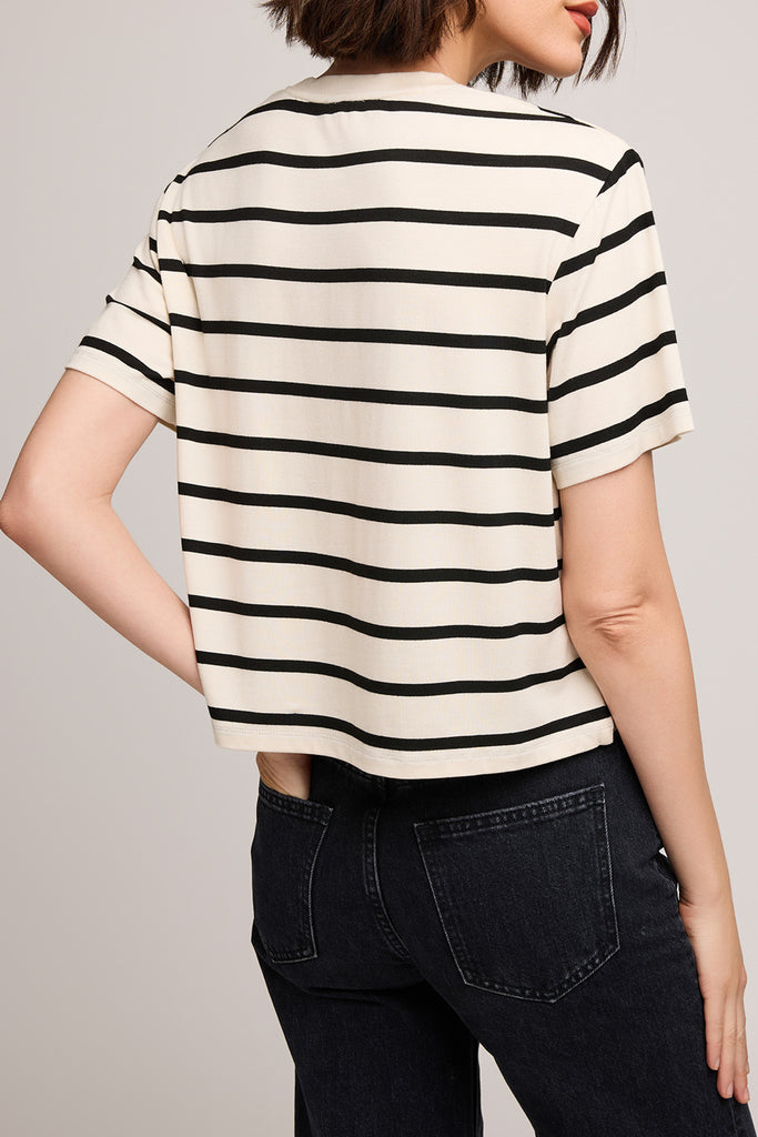 Personify Shopsoft jersey tee in classic cream and black stripes. crewneck tee is slightly stretchy and has a boxy relaxed fit. tee makes a great wardrobe staple for layering or for year-round wear.
