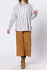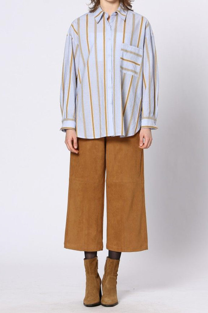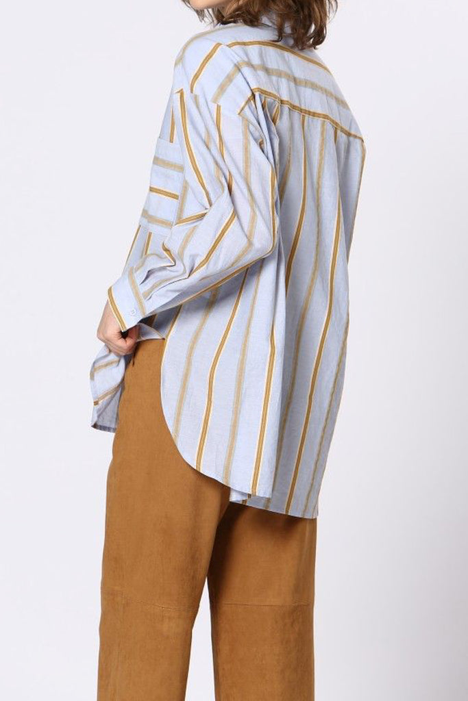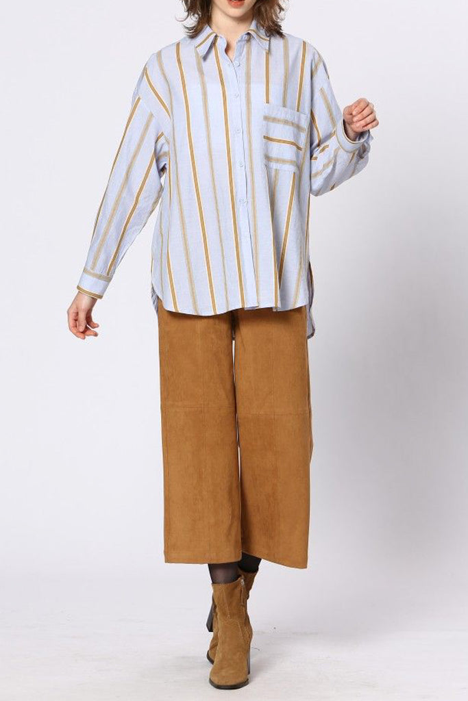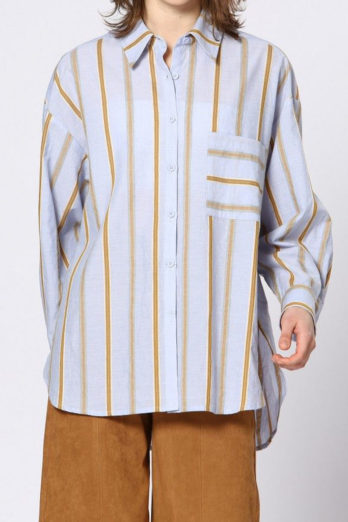 Personify Shopoversized button down top in light periwinkle blue with golden tan stripes. collared top features a button front, breast pocket with contrasting stripe details, roomy long sleeves with buttoned wrist cuffs, split sides, and a loose, fashion-forward silhouette. top can be styled with jeans for a casual vibe or worn with trousers or black pants for a more professional look.