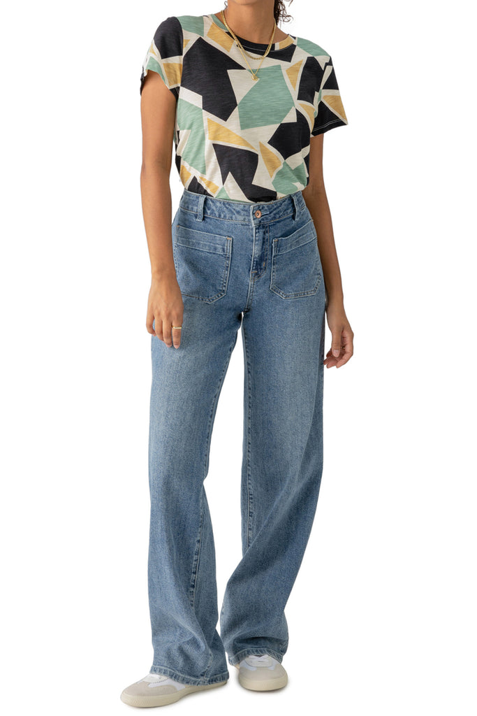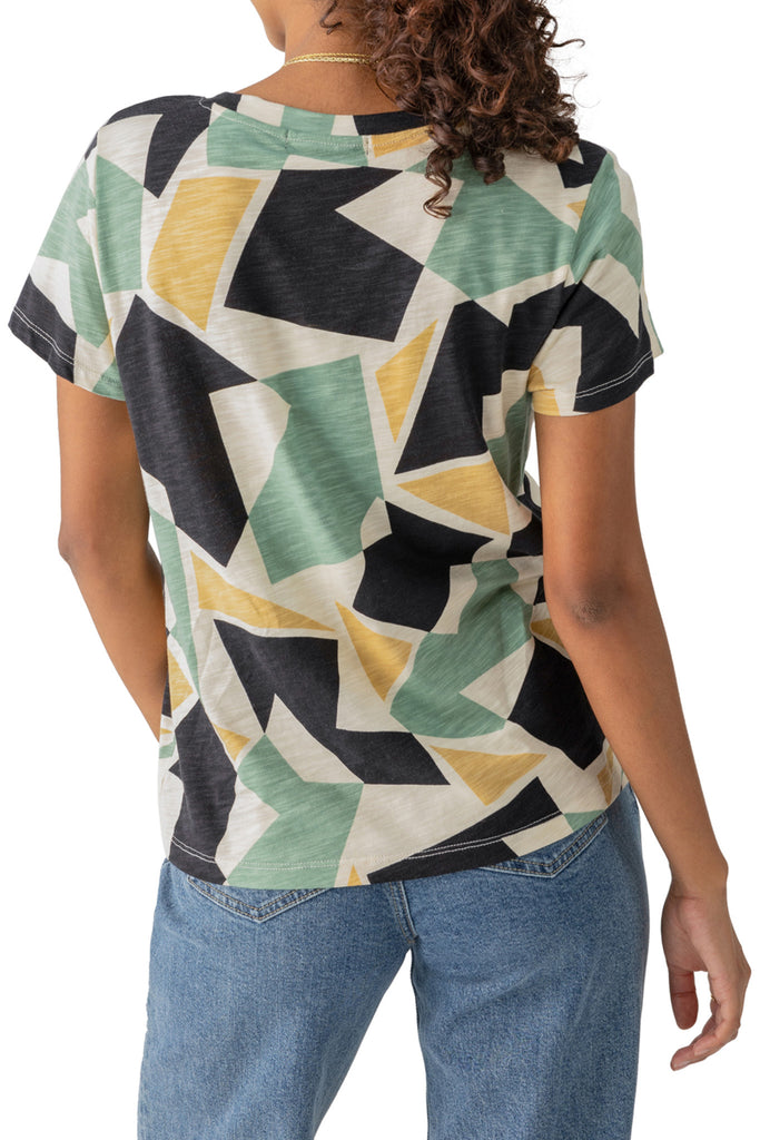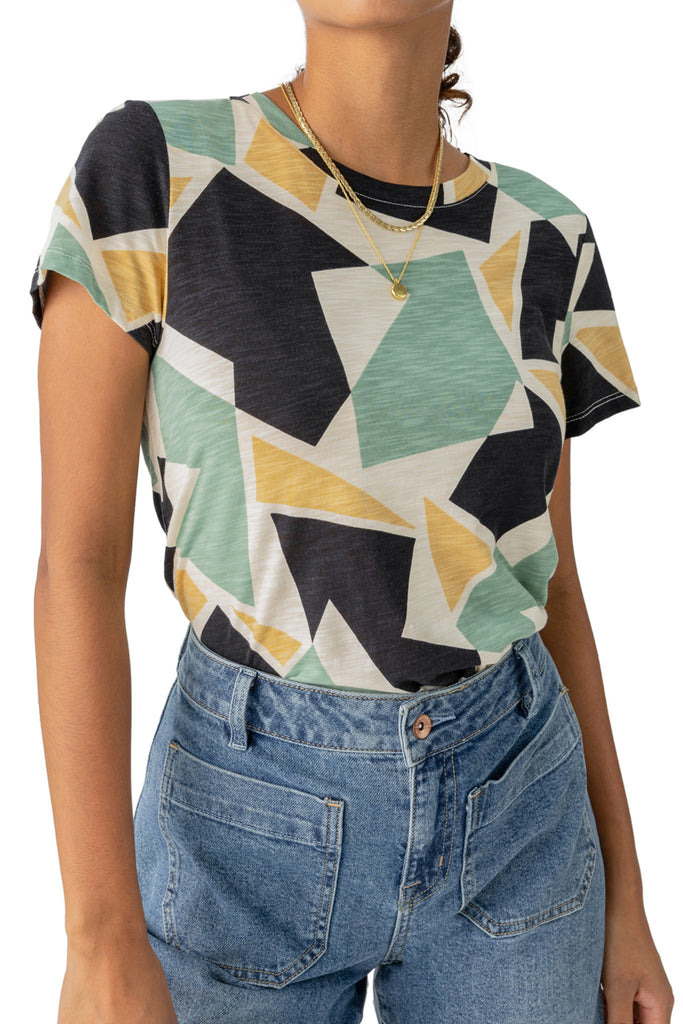 Personify Shopbasic t-shirt with a cool geometric pattern in shades of black, white, butter yellow, and pale seafoam green. soft, lightweight tee features a crew neckline, short sleeves, and a relaxed fit. versatile tee can be paired with a variety of bottoms and is a perfect casual tee for the end of summer and into the fall. tee is available in an extended size range.