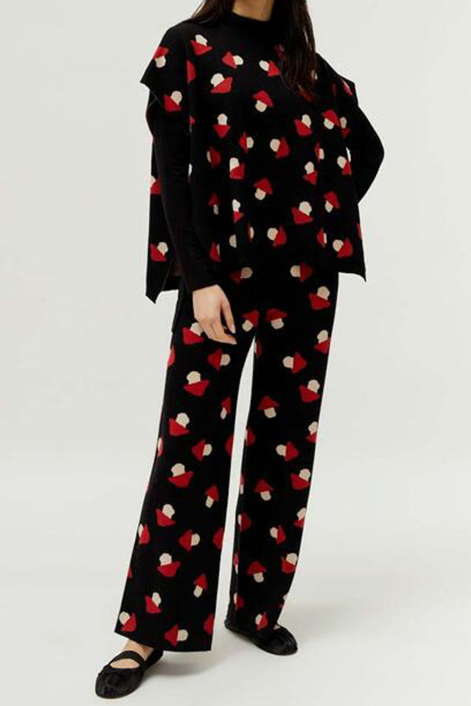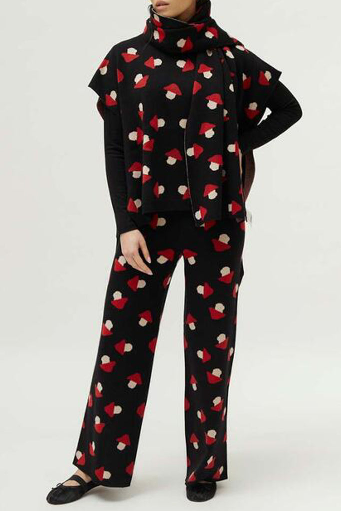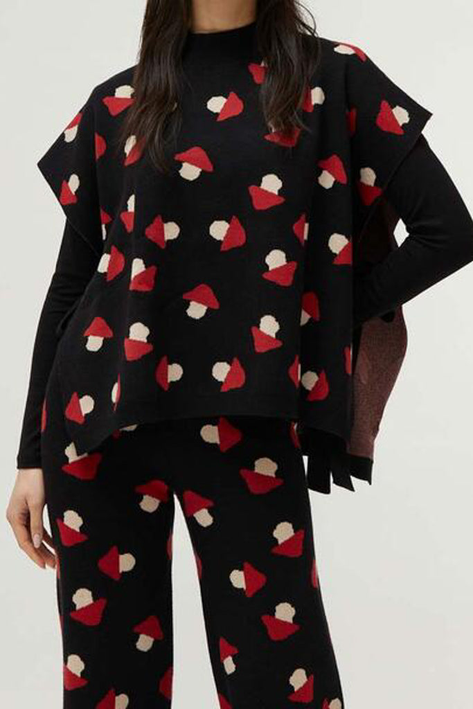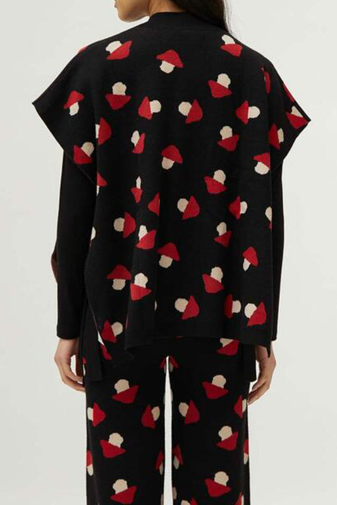 Personify Shopadorable black vest/poncho with a sweet red and white toadstool pattern. soft and lightweight knit top features a crew neckline and tie details on sides, allowing wearer to adjust sizing as needed. cute vest can be worn with anything, but it would look great over a dress, jumpsuit, or long sleeve top.