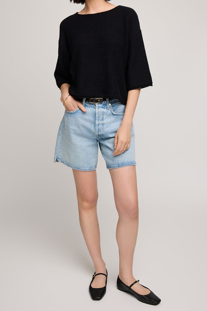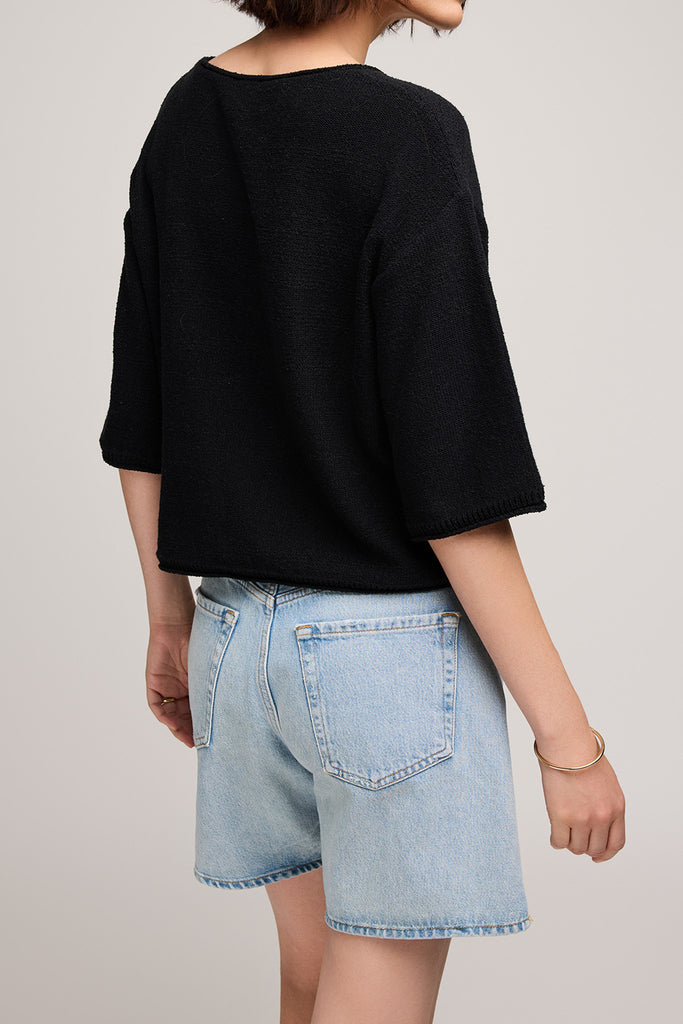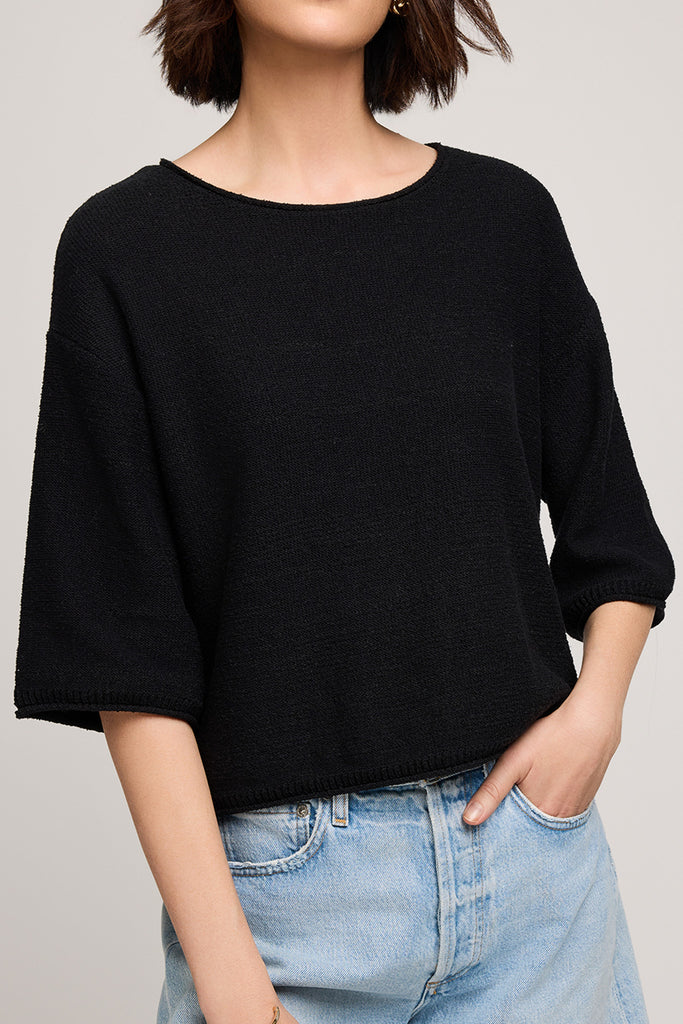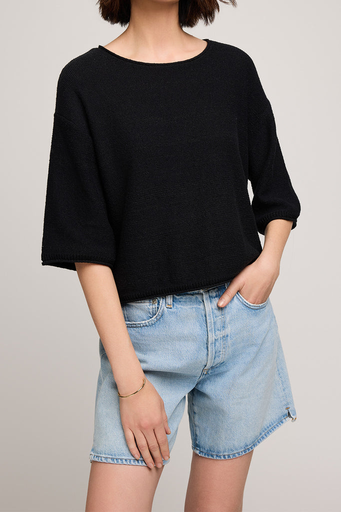 Personify Shopsoft and comfortable knit top in classic black. boxy top features a wide round neckline, dropped shoulders, loose half sleeves, and rolled hems for a cool, casual look. top feels nice against the skin and makes a great transitional piece to bring into the fall.