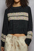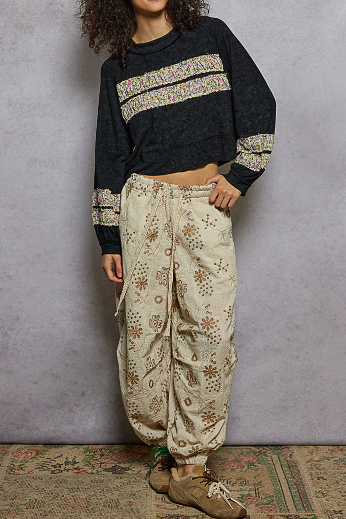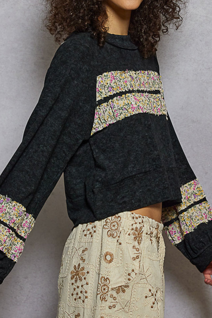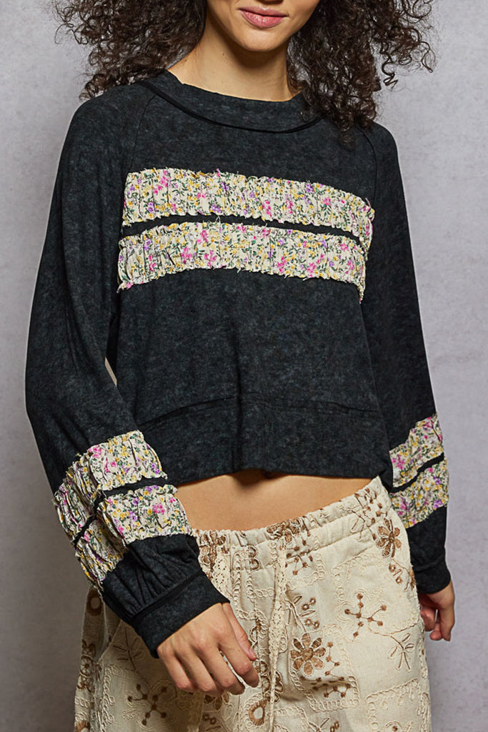 Personify Shopsoft and comfortable pullover in charcoal grey with flirty floral ruffle stripes. raglan-style pullover is lightweight and features a crew neckline, roomy long sleeves, and a slightly cropped bottom hem. pullover makes a great top or lightweight layer to wear into the spring.
