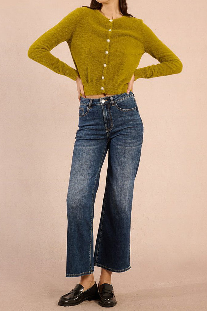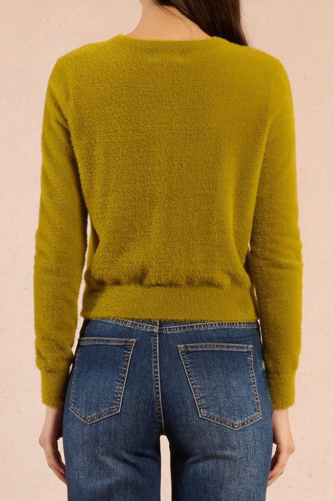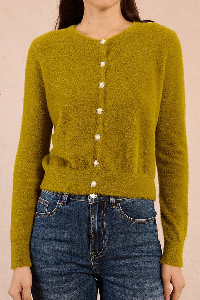 Personify Shopfuzzy and soft knit cardigan in bold lime green. cardigan has a fitted silhouette and features a crew neckline, embellished pearl button front, and a tightened bottom hem, giving sweater a closer feel at the waist. sweater is perfect to pair with jeans, trousers, black pants, or a skirt.