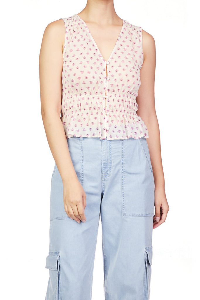 Personify Shoplightweight button down top in a lovely lilac-hued floral pattern. sweet and feminine top features a v neckline, smocked details on shoulders and waist, and a ruffled bottom hem. summery top looks great with your favorite jeans, shorts, or skirt. consider sizing up if you are busty.