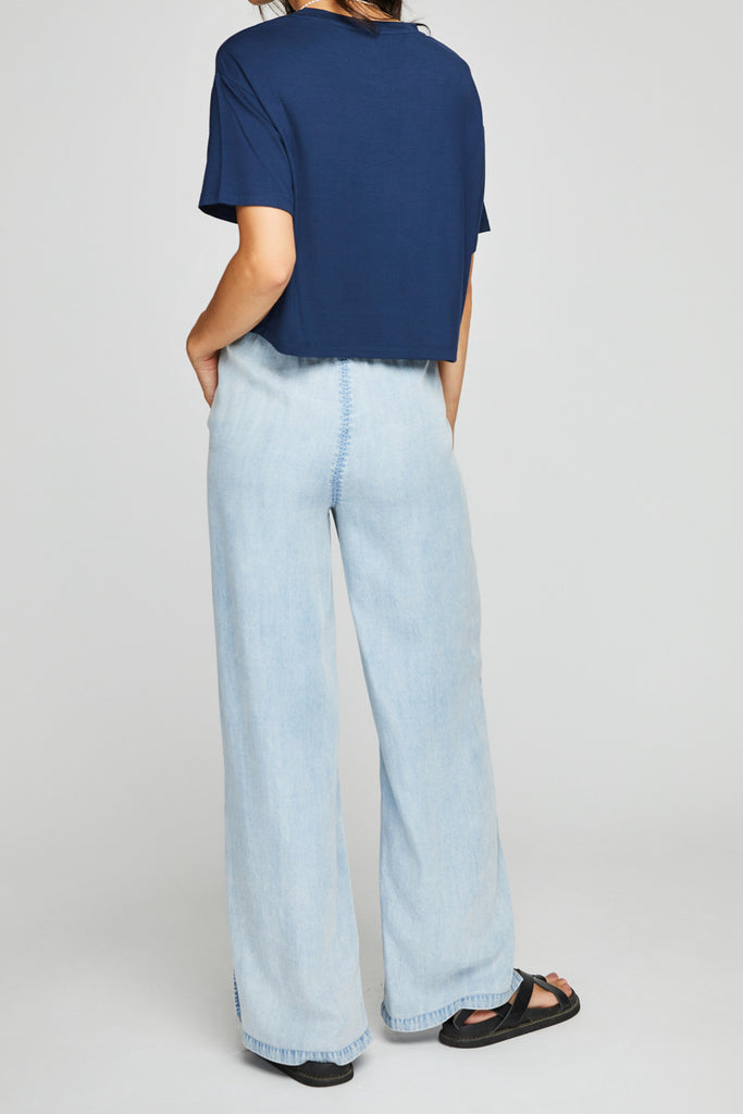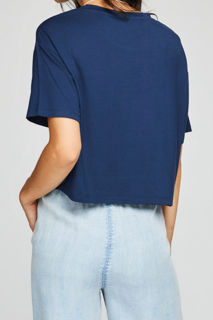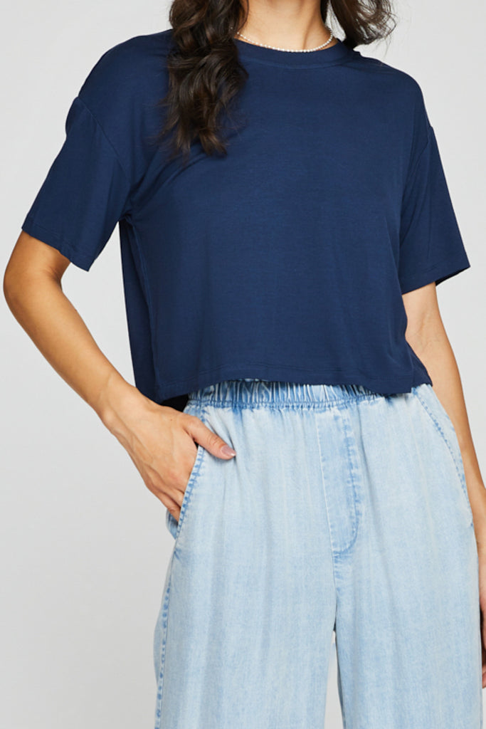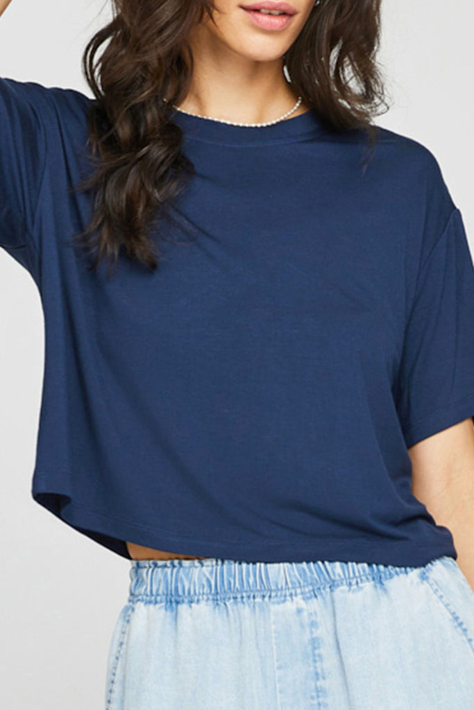 Personify Shopultra soft and stretchy tee in deep navy blue. tee has a classic silhouette and features a crew neckline, dropped shoulders, and a boxy, slightly cropped fit. tee makes an easy to wear and nice feeling basic for summer.