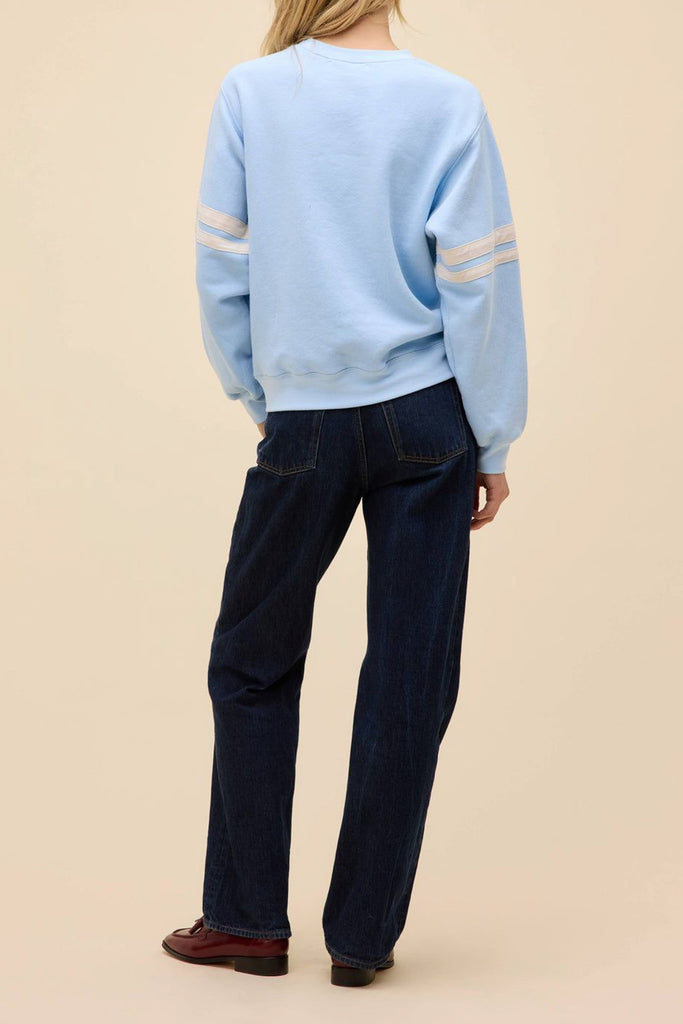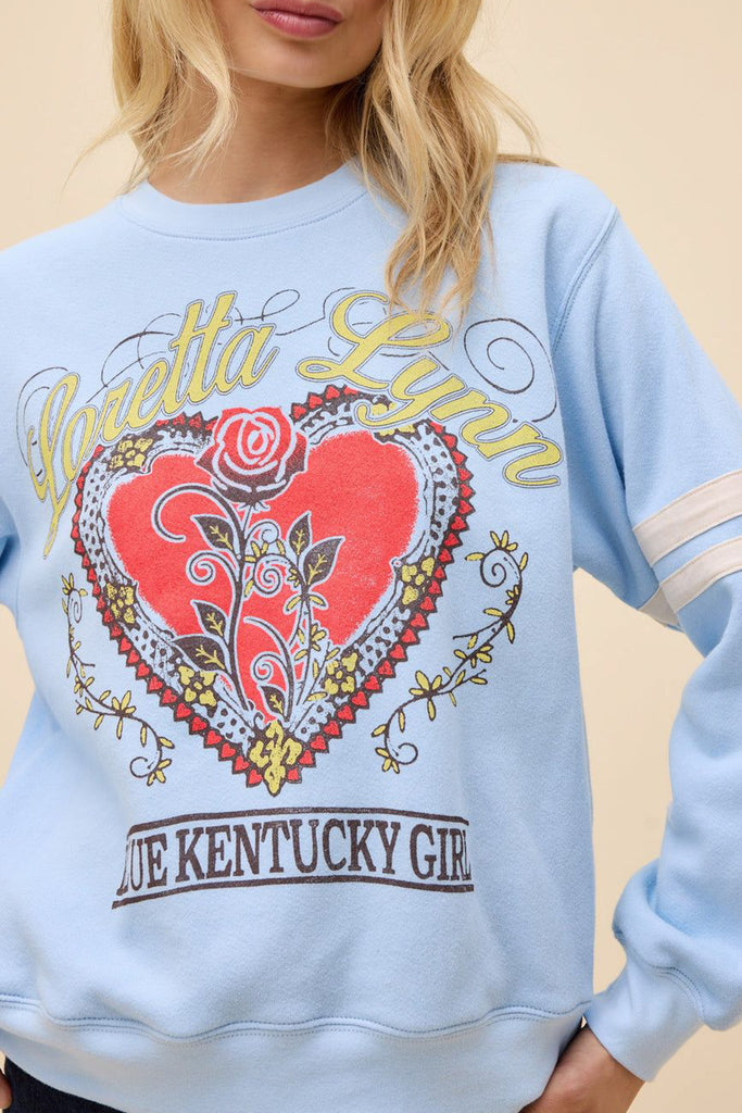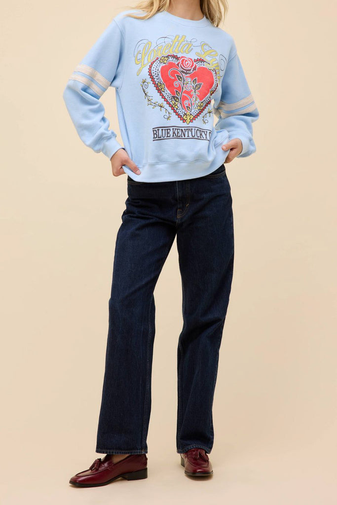 Personify Shopdaydreamer sky blue sweatshirt celebrating country legend loretta lynn. sweatshirt features the artist's name and iconic album title, as well as a western-inspired heart and rose motif. varsity sweatshirt has a classic fit and is made from a soft cotton blend fleece. it features white stripe details on the sleeves for a sporty, preppy vibe.