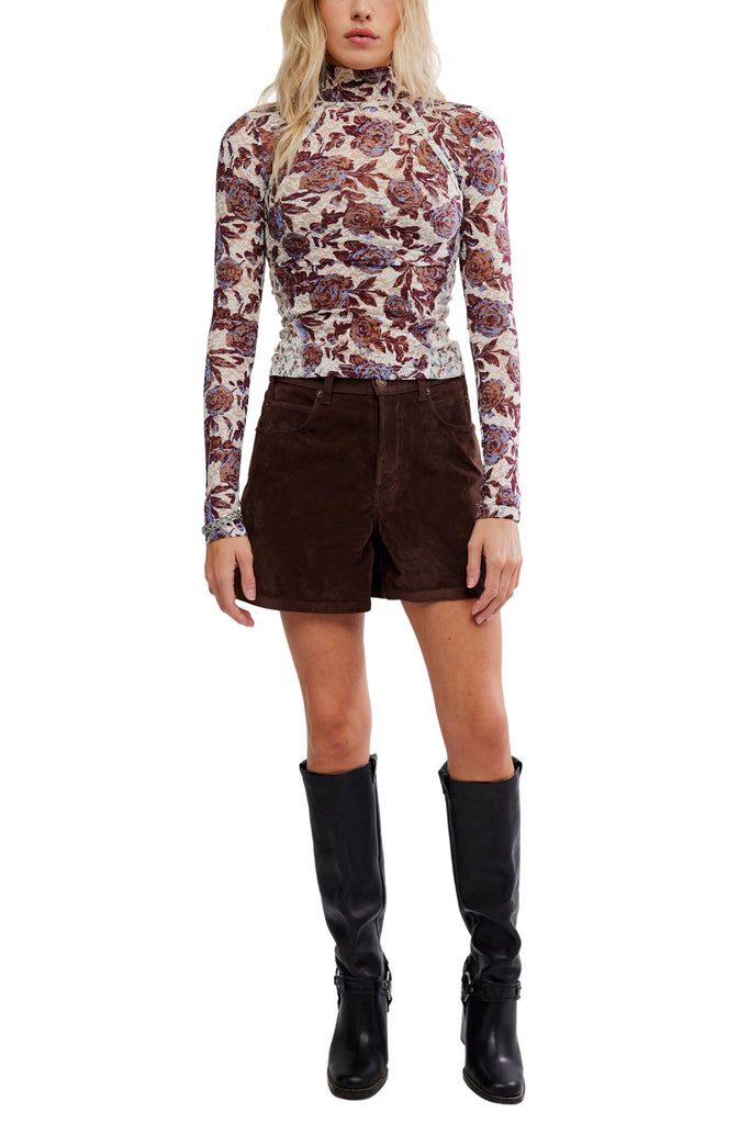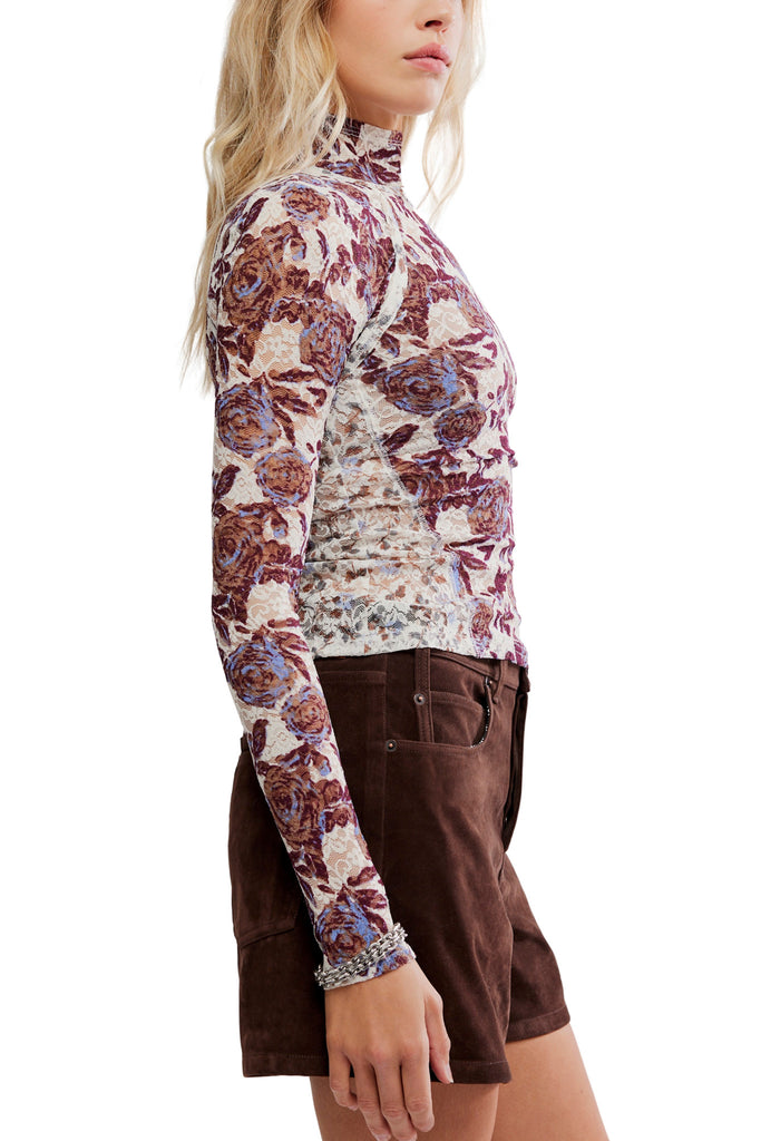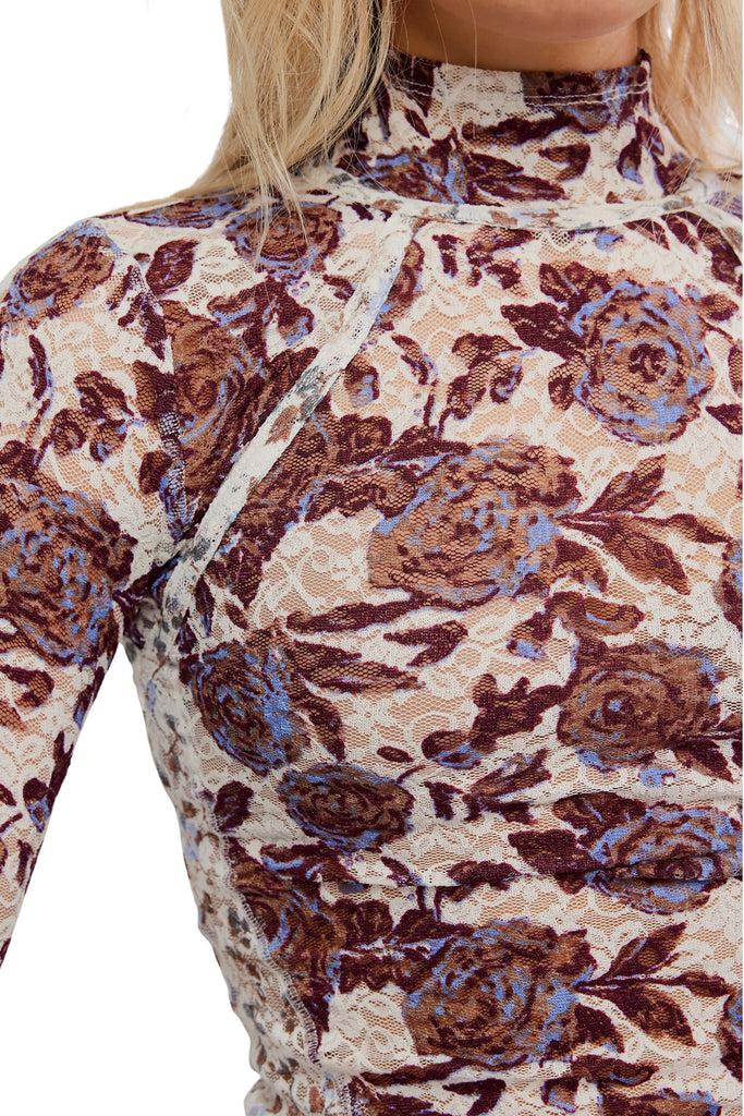 Personify Shopfree people statement printed lace top with a lovely floral design in chocolate brown and bright blue. fitted top is sheer and unlined, and it features a turtle neckline with keyhole button closure on back, full length torso, and a form-fitting silhouette. top makes a great base layer to wear under a sweater vest, jumpsuit, or overalls.
