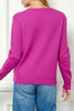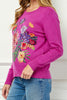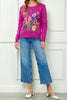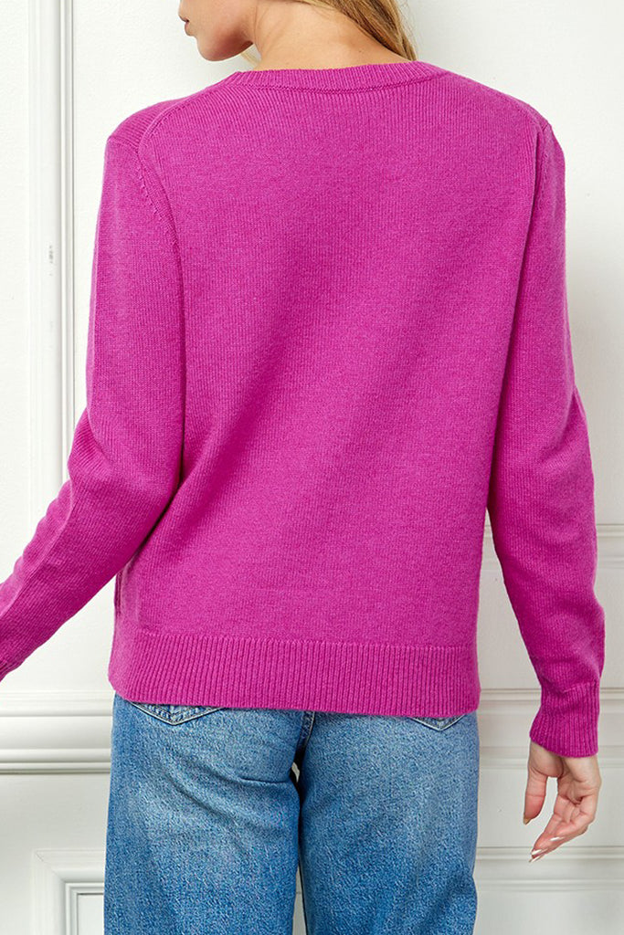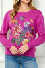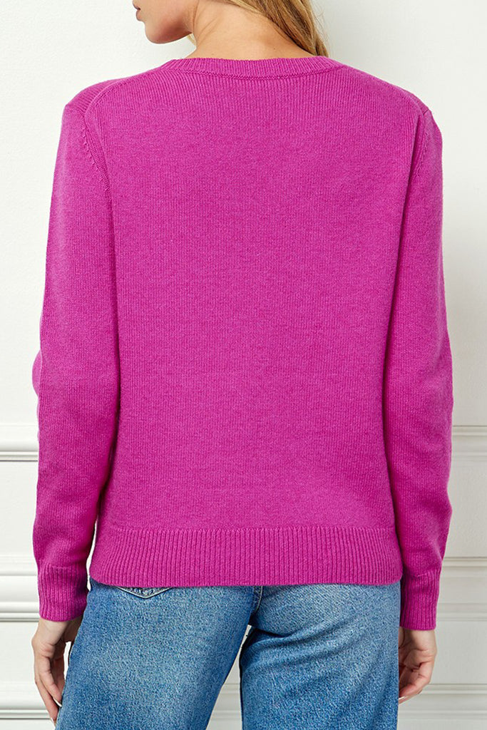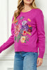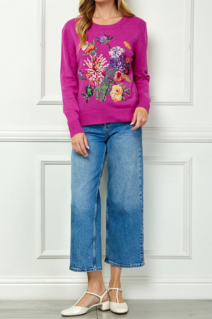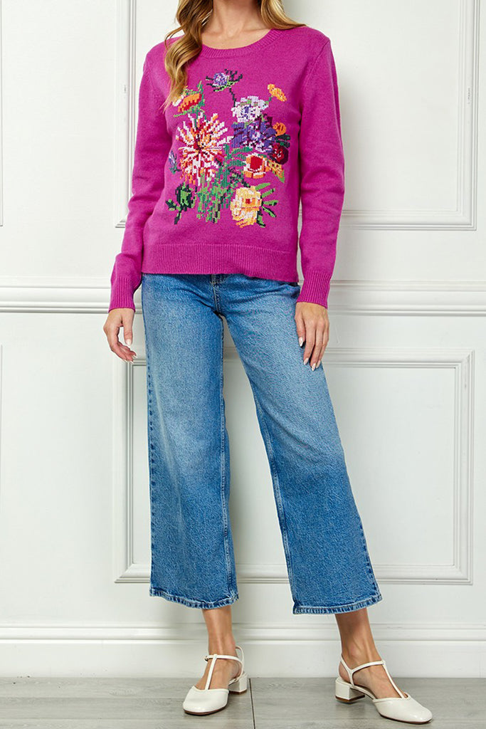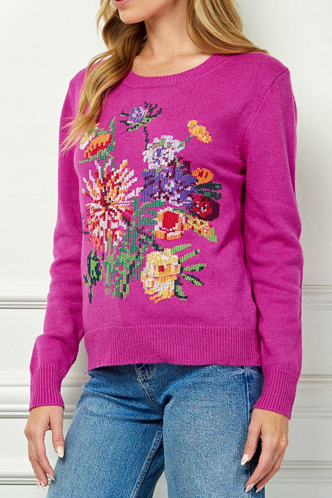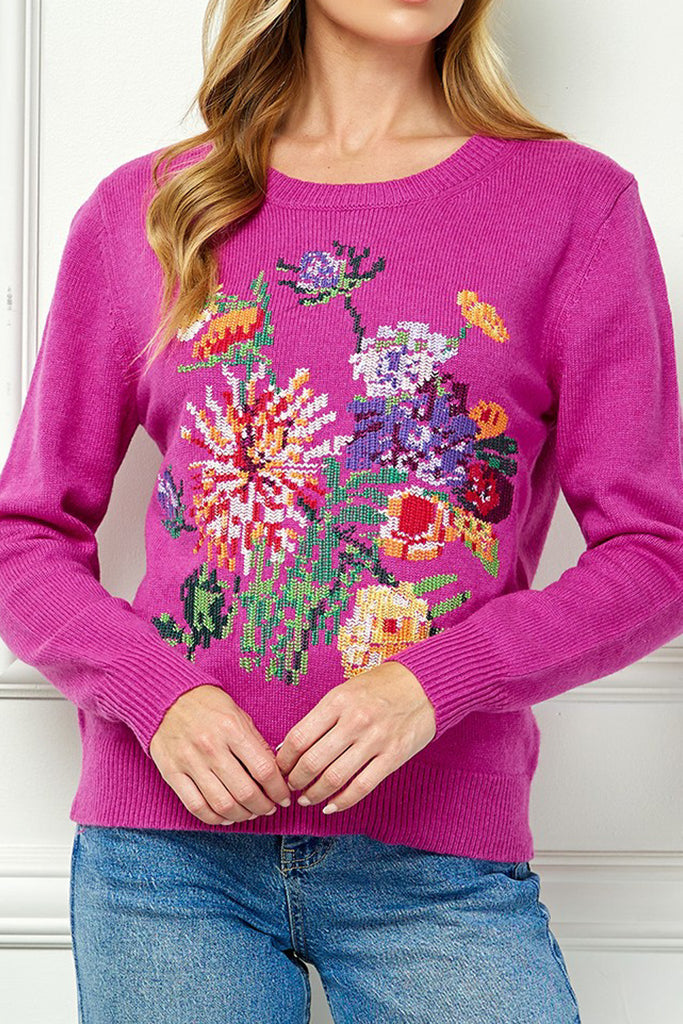 magenta pullover with gorgeous cross stitch-inspired floral embroidery on front. pullover has a soft fabrication and a classic silhouette. it features a crew neckline, long sleeves, a relaxed fit, and ribbed details on the neckline, wrist cuffs, and bottom hem. colorful sweater is perfect to pair with jeans, and it makes a thoughtful gift.