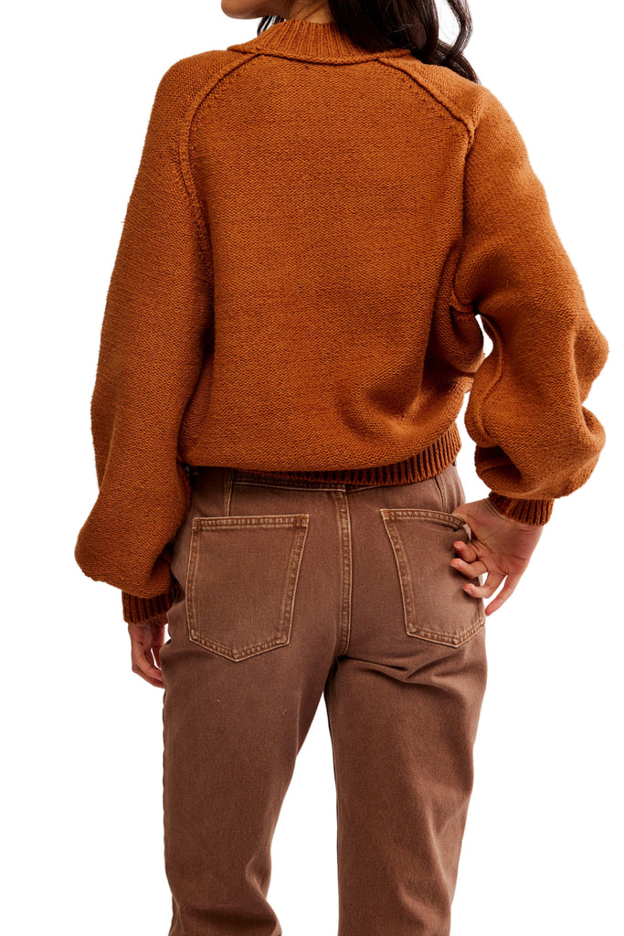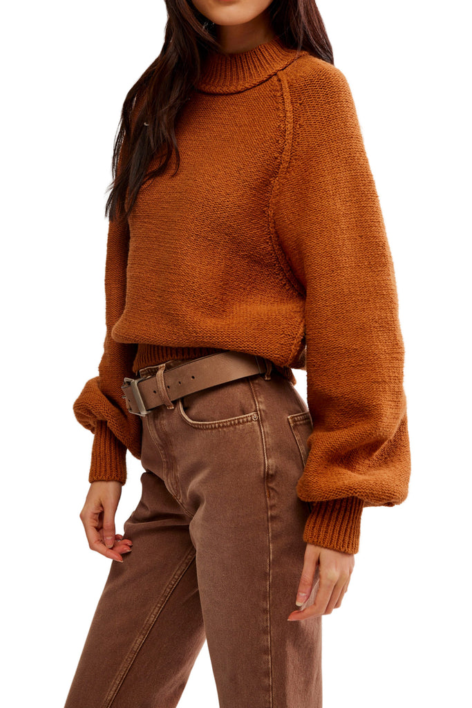 Personify Shopfree people perfectly slouchy and cozy pullover in rich and warm saddle brown. soft knit heavy sweater features a mock neckline, raglan-cut sleeves with elasticated cuffs, ribbed hems, and exposed seam details throughout. sweater has a timeless look and versatile color that works with a variety of bottoms this fall and into the winter.