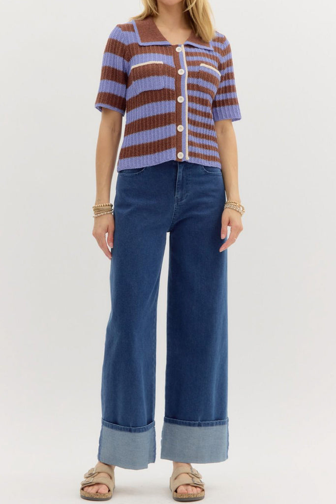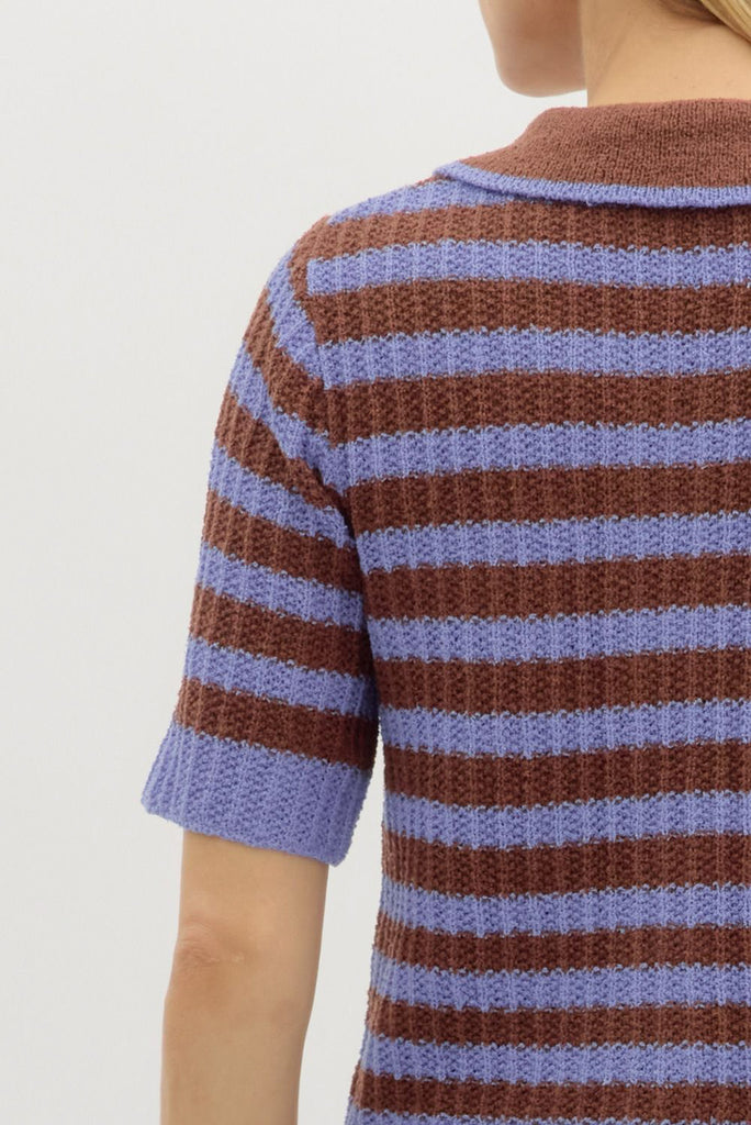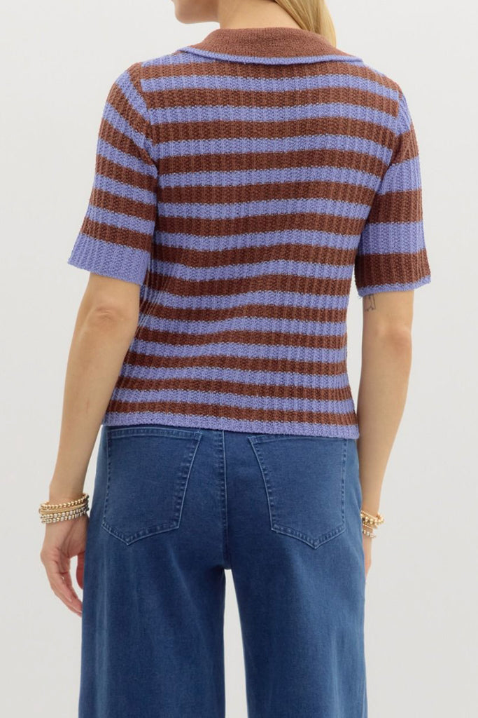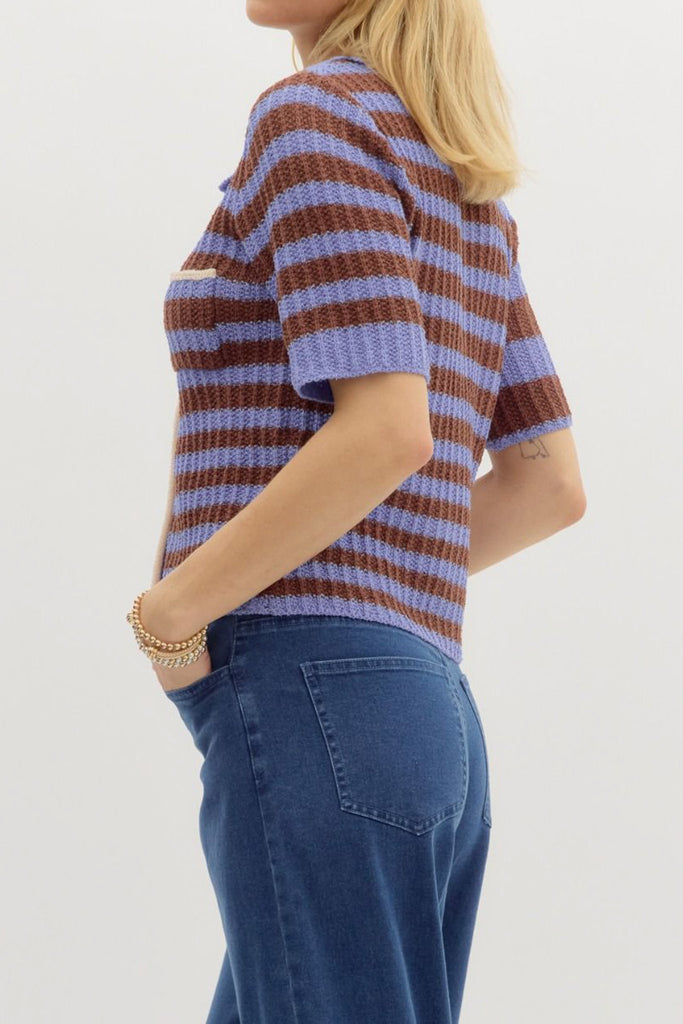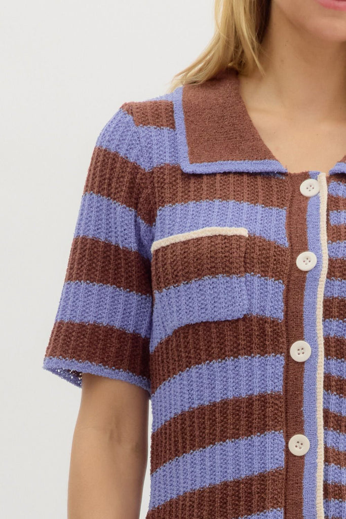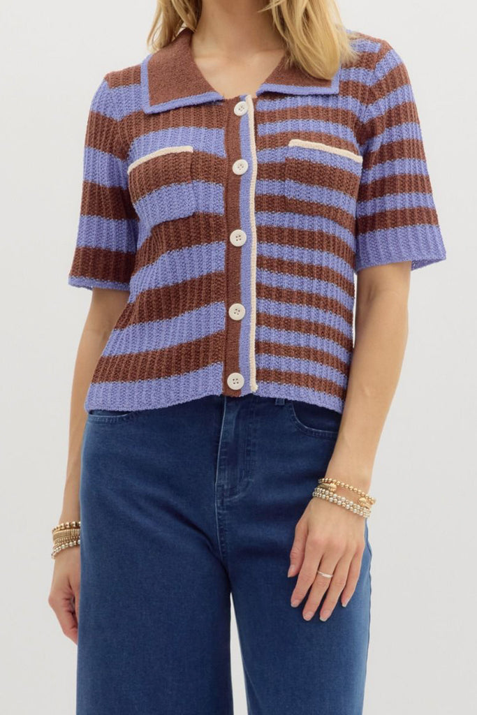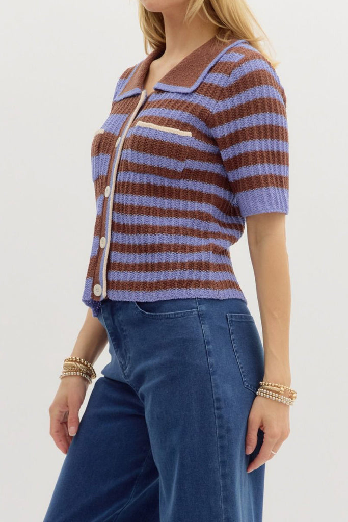 Personify Shoplightweight knit top in espresso brown and periwinkle blue contrasting stripes. ribbed knit top is soft and features a wide collar, functional button front with white stripe, two breast pockets, and a relaxed fit. summery top is perfect to pair with shorts in warm weather, but looks great with jeans or trousers as the weather cools. top runs true to size.
