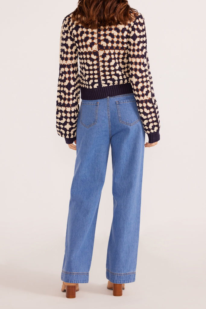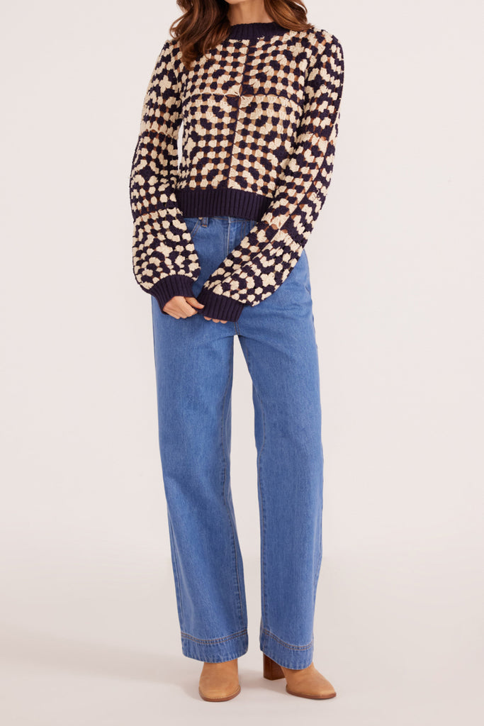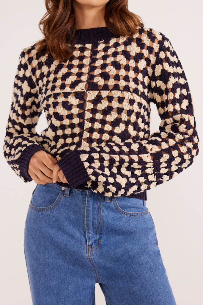 Personify Shopbeautifully made crocheted sweater in deep navy blue and cream. sweater features a crew neckline, roomy long sleeves, a slightly cropped length, and a ribbed knit neckline, cuffs, and bottom hem. cute sweater is perfect to wear this fall and into the winter. jumper is available in an extended size range.