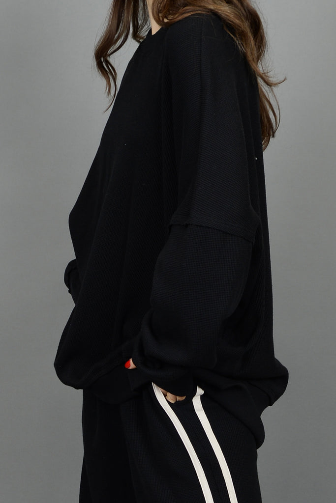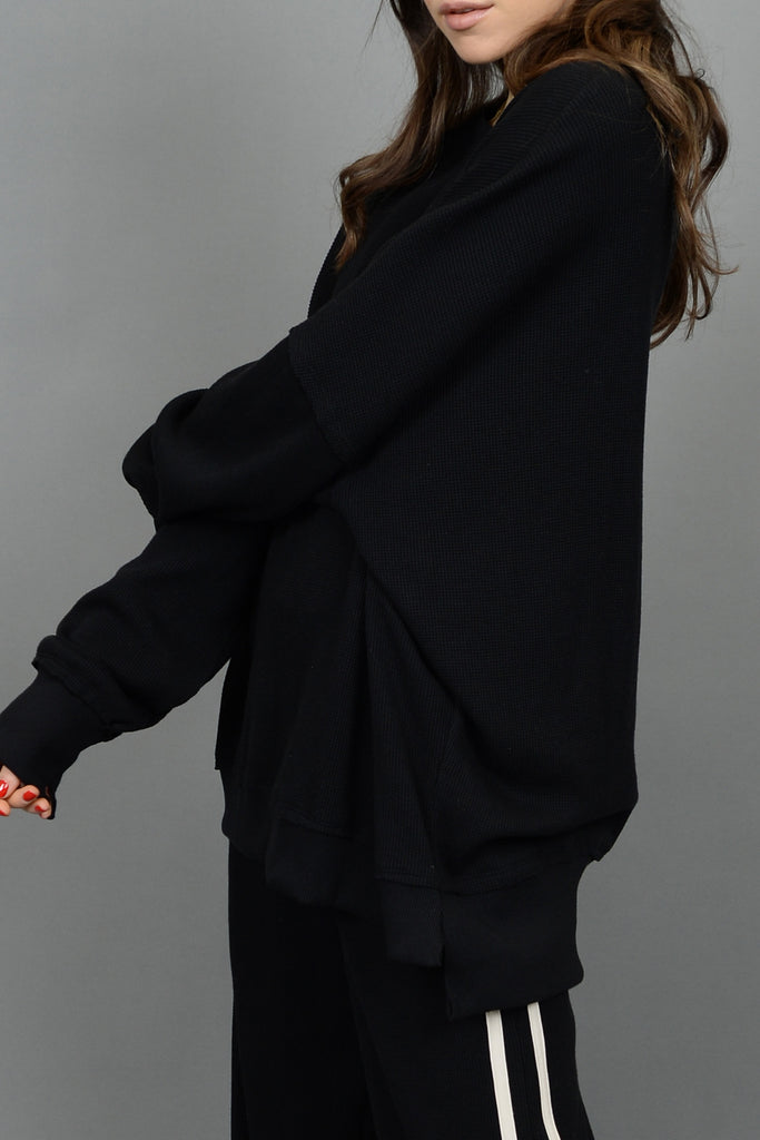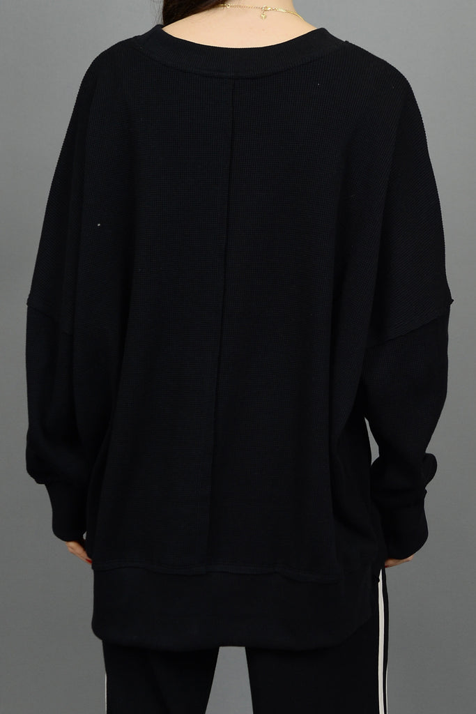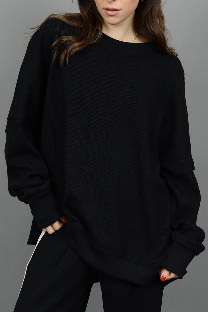 Personify Shopcomfortable oversized waffle knit pullover in black. cozy pullover features a crew neckline, dropped shoulders, extra roomy long sleeves, split sides, and a slightly longer back hem. pair with the fanila pull on flares for cute, coordinated loungewear or wear with your favorite jeans for a casual look.