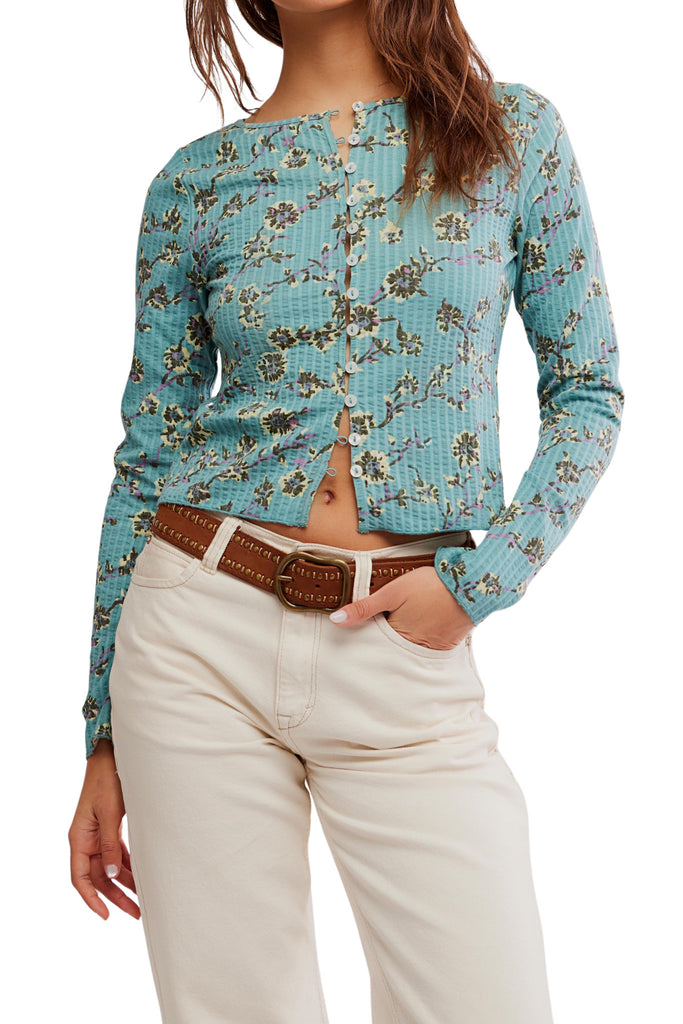 Personify Shopfree people ribbed knit top in a pretty mineral blue floral pattern. this is an updated take on the fan favorite tilly vest. slim-fitting top has a stretchy feel and features a crew neckline and button-front closures. cute patterned top is lightweight and makes a great transitional piece to bring into the fall.