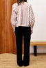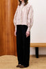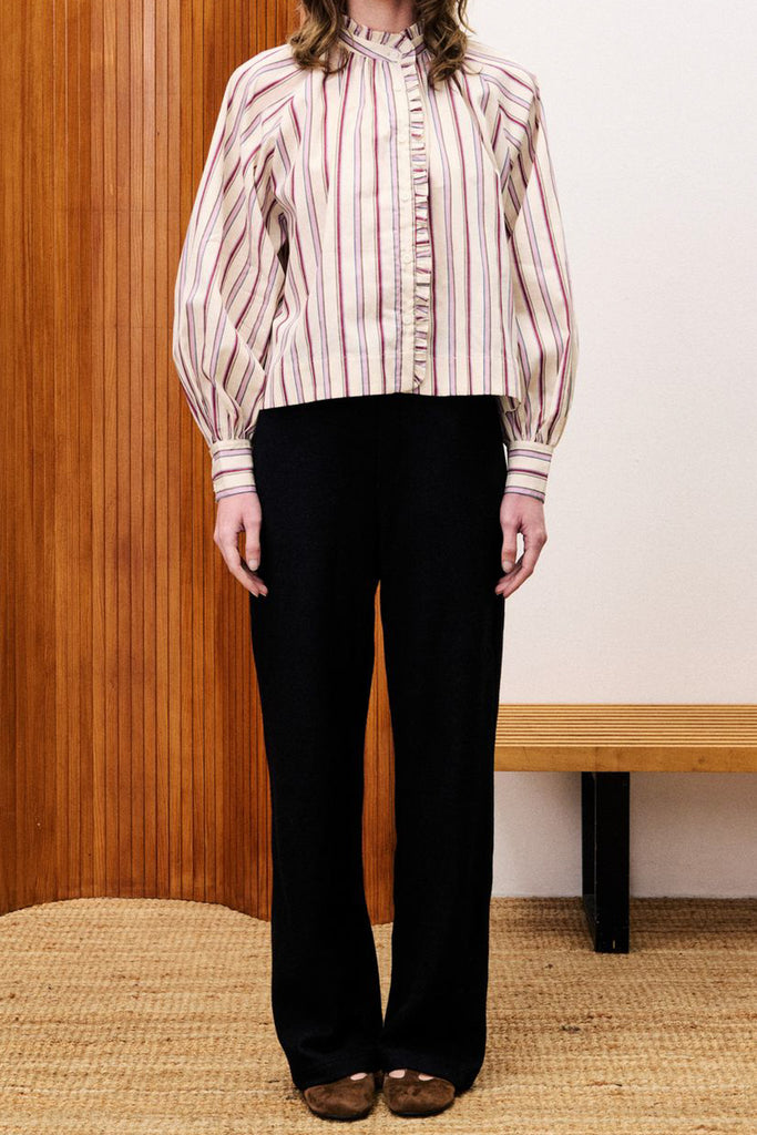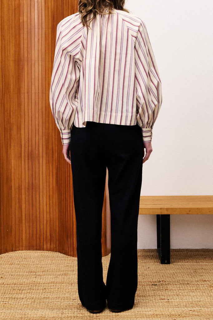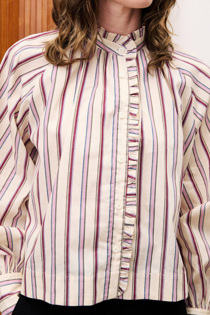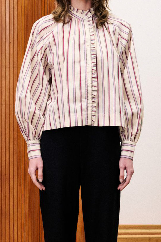 Personify Shopelevated button down top in purple and cream stripes. cotton blouse features a high ruffled neckline, button front with ruffled placket, voluminous long sleeves with buttoned wrist cuffs, and a slightly longer back hem. pretty blouse is perfect for work or casual wear.