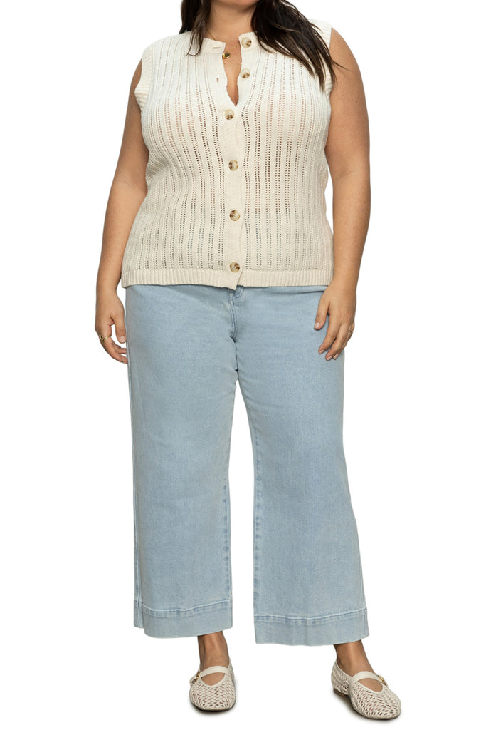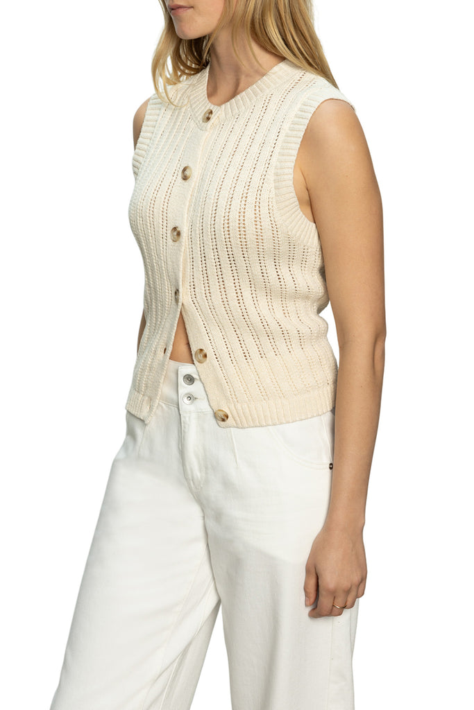 Personify Shopbeautifully knit sleeveless shell top in a natural cream color. soft and stretchy top features a crew neckline, button front, and lovely pointelle knit details throughout. versatile top can be worn open, closed, on its own, or layered. top is also available in warm sepia brown.