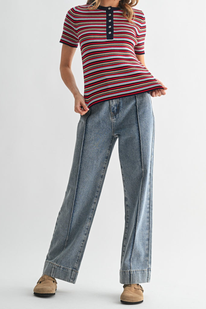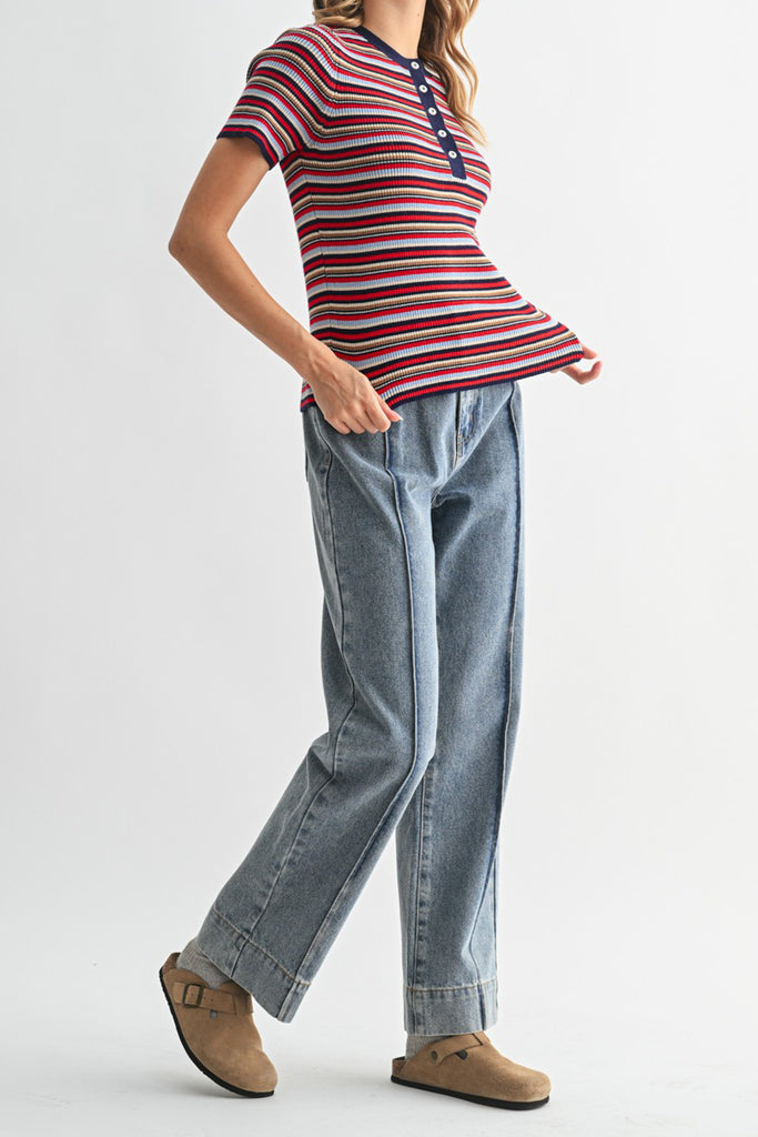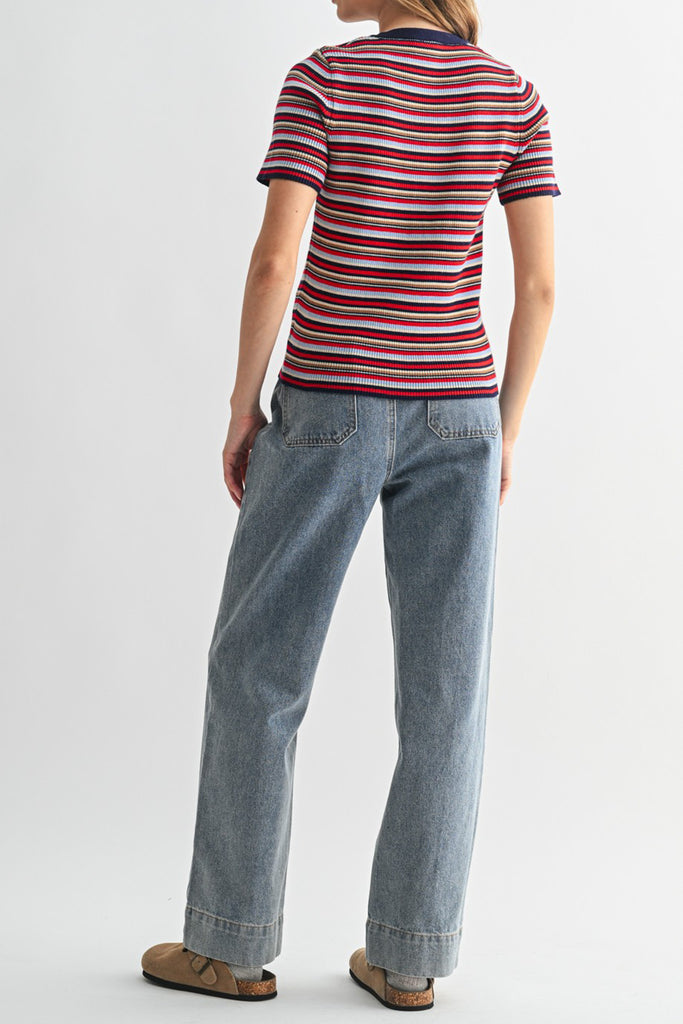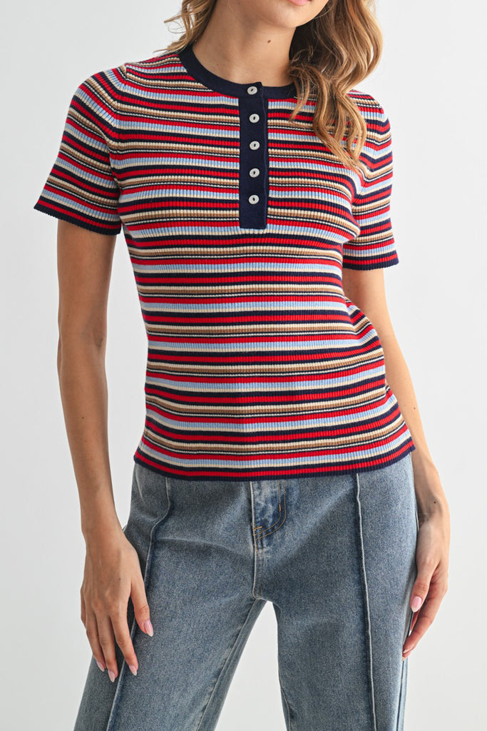 Personify Shopcomfortable knit top with americana/retro-inspired stripes in navy blue, white, tan, red, and sky blue. soft and stretchy top is form-fitting and features a crew neckline, half button front, and a full length, perfect for tucking in. top makes a great transitional piece to wear into the fall.