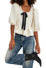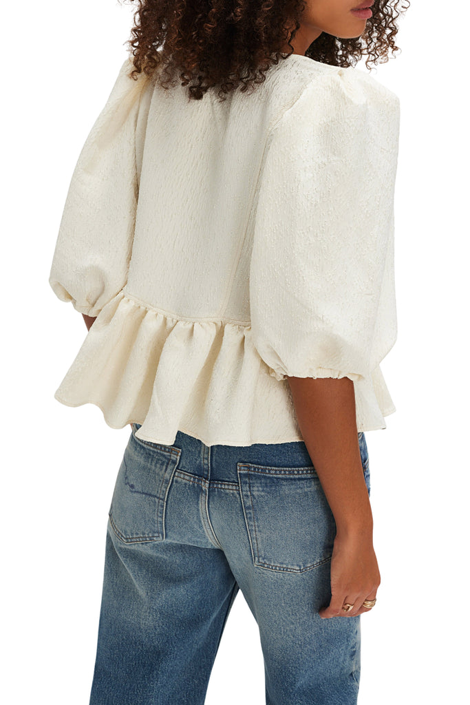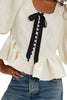 Personify Shopfree people romantic feeling top in ivory and black. chic top is made from a satiny jacquard fabric and has a slightly oversized fit. it features a scoop neckline, puffy short-sleeves, contrast bow and button detailing in black, and a frilly ruffled bottom hem. textured top can be dressed up or down for a variety of occasions.