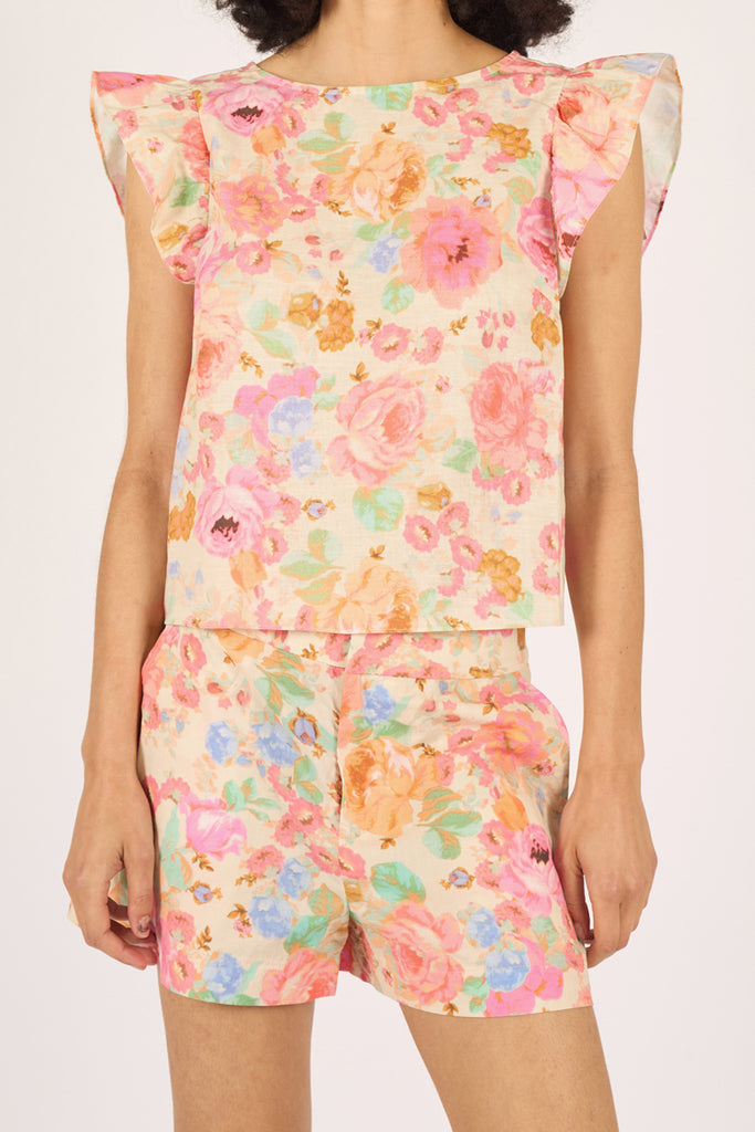 Personify Shoppretty top in a gorgeously springy floral pattern. lightweight top features a crew neckline, ruffled cap sleeves, and a peephole fastening on back. pair this top with the pink flower wide boy trousers for a sweet springy look or wear with your favorite bottoms to suit your own unique style.