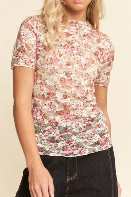 Personify Shopshort sleeve top made from pink and cream floral lace/mesh. fitted top features a high crew neckline and a slightly sheer fabrication. top makes a perfect layering piece to wear under overalls, jumpsuits, or a vest or sweater as the weather cools.