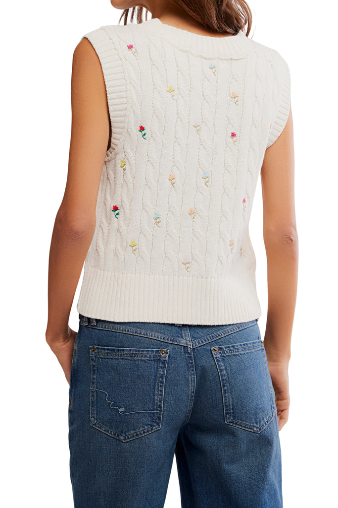 Personify Shopfree people cable knit vest with colorful floral embroidered details. bright white vest features a v neckline, ribbed trim, embroidery on front and back, and a slouchy, slightly cropped fit. cotton vest can be worn solo and then layered as the weather cools.
