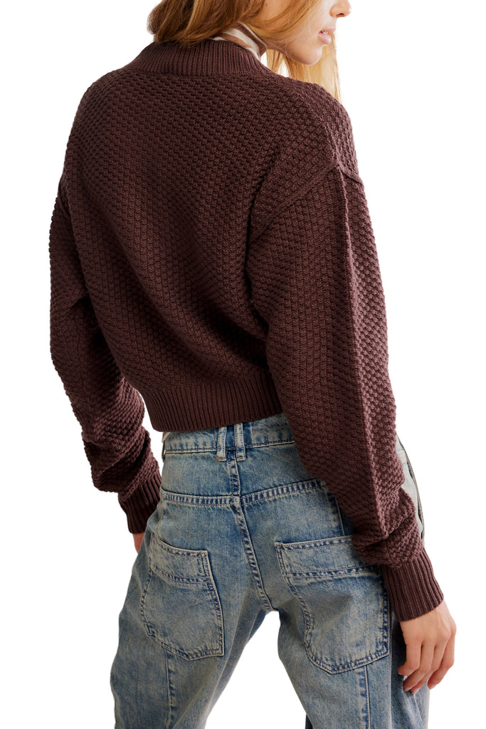 Personify Shopfree people textured cardigan in chocolate brown. woven cardigan has a button front with tortoise shell buttons and features a crew neckline, roomy long sleeves, and dropped shoulders for a casual, relaxed look. sweater can be styled many different ways into the fall and winter.