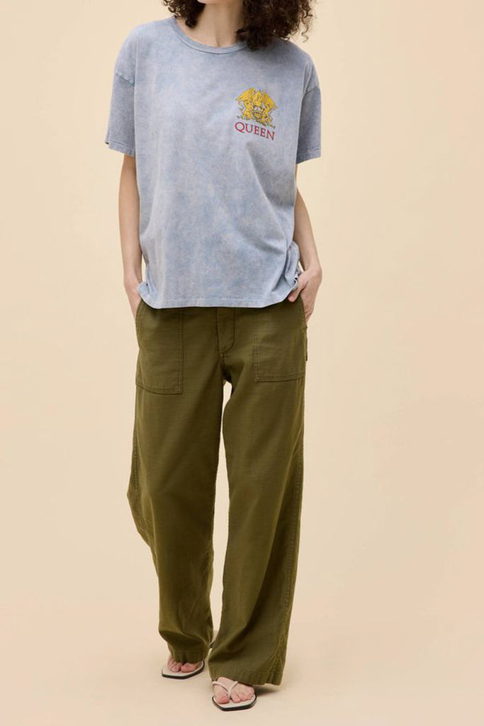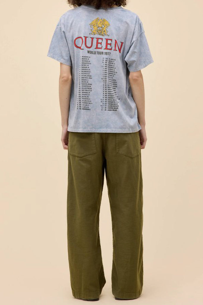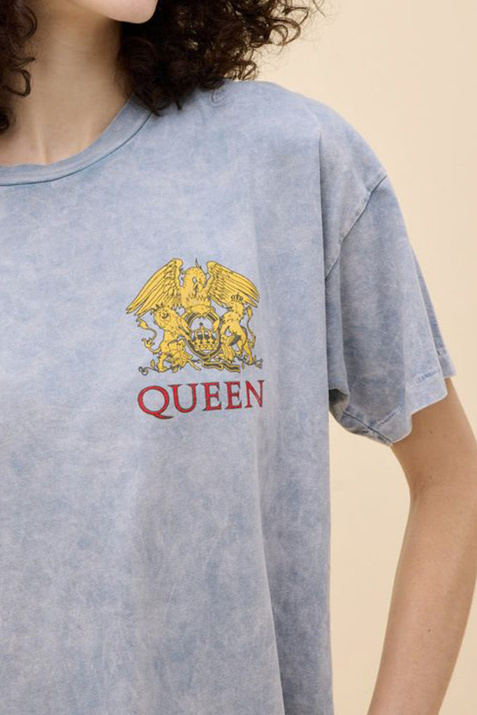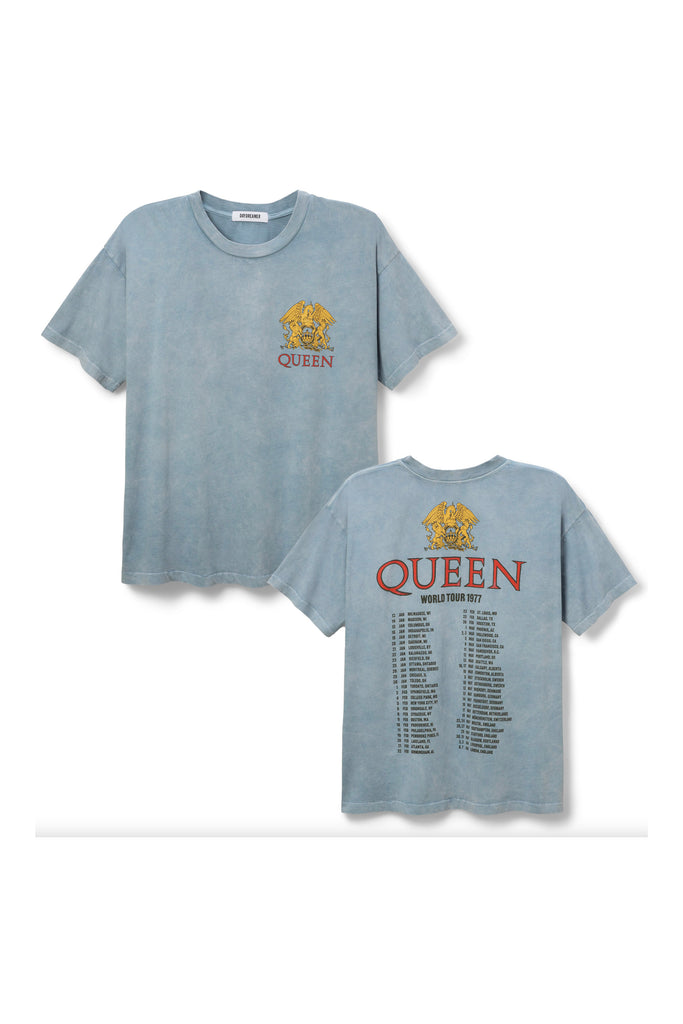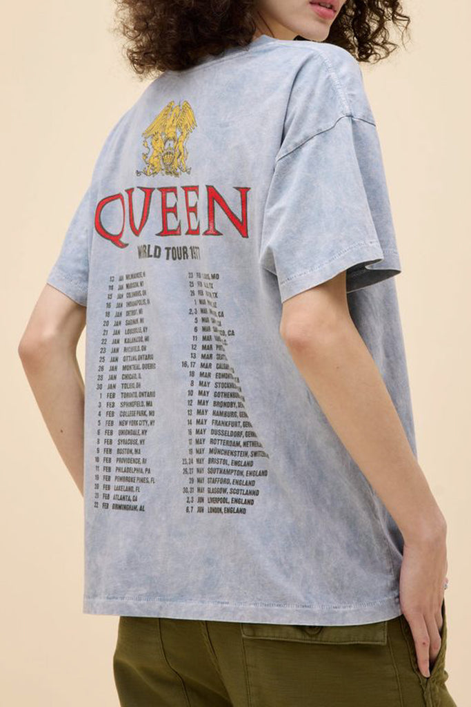 Personify Shopdaydreamer acid washed light blue tee celebrating queen's 1977 world tour. tee features the band's logo stamped on the left chest with tour details included on the back. the merch tee has an oversized fit and is designed in midweight cotton to achieve the perfect drape.