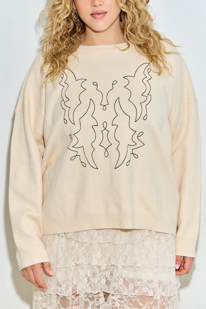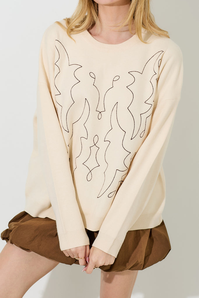 Personify Shopcream colored pullover with a western-inspired embroidered design. slightly oversized sweater has a soft fabrication and features a crew neckline, roomy long sleeves, embroidered details in deep brown, and ribbing on the neckline, wrist cuffs, and bottom hem. cozy and comfortable sweater is available in an inclusive size range.