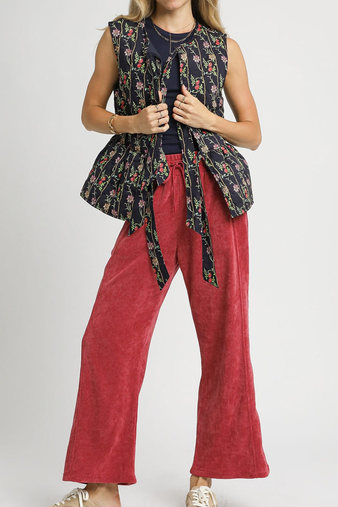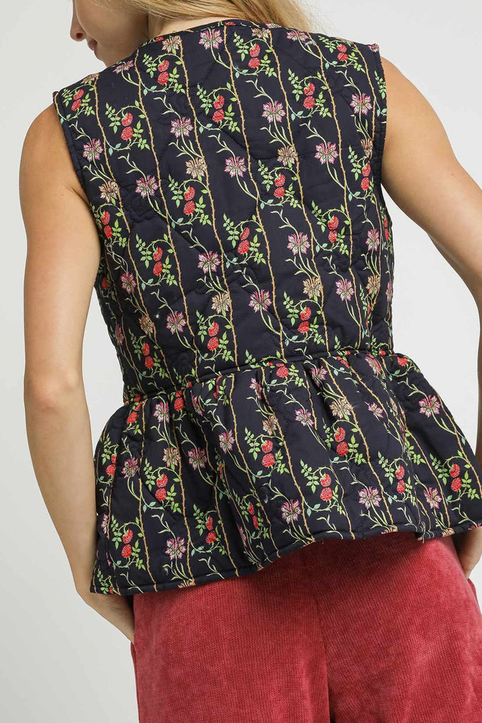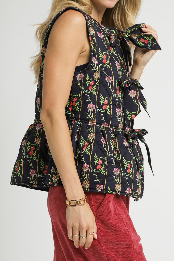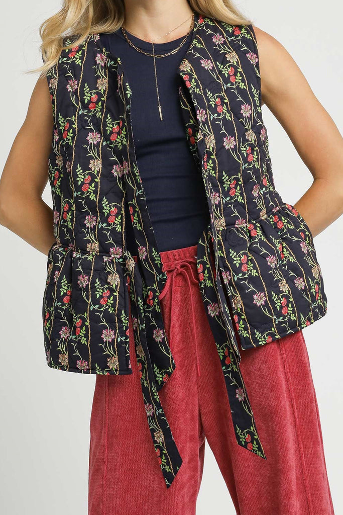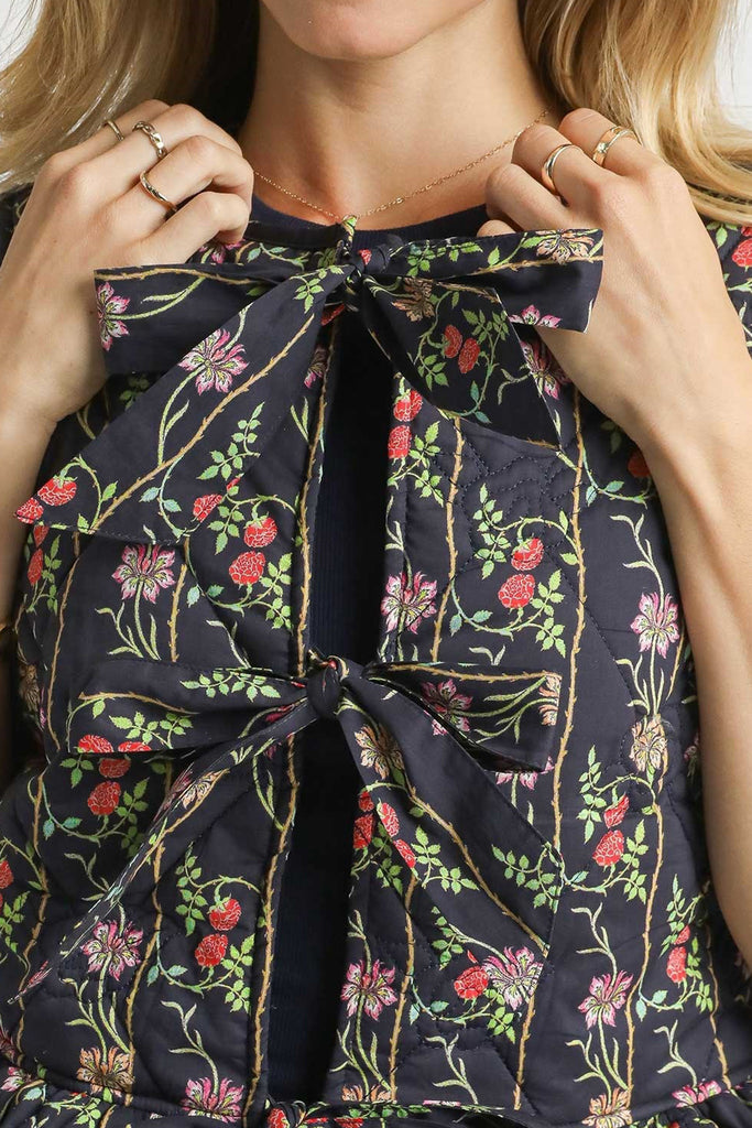 Personify Shopspecial quilted vest in navy blue with a romantic floral pattern. peplum-style vest features a crew neckline, trendy front tie details, a ruffled bottom hem, and a relaxed fit. vest can be worn open or tied closed, and it makes a sweet layer to bring into the fall and winter.