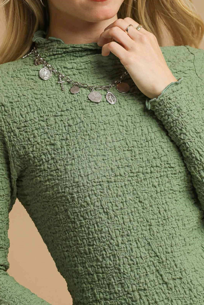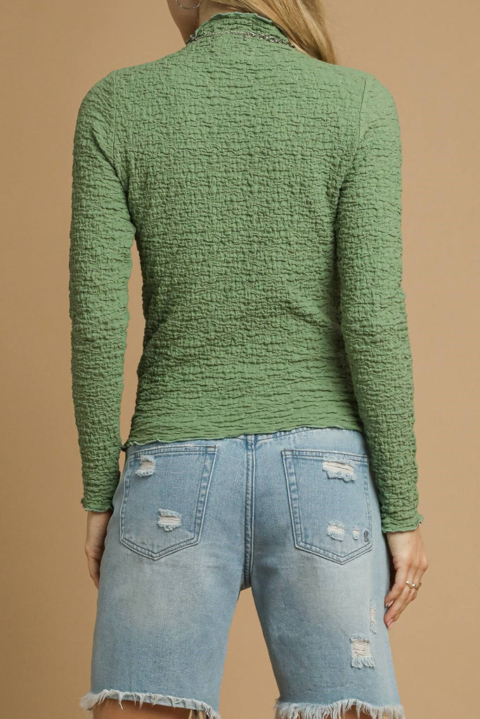 Personify Shopsage green long sleeve top with a subtle texture. stretchy top features a mock neckline, slightly relaxed silhouette, and 90s inspired lettuce edge hems throughout. top can be worn on its own or perfectly layered under vests, overalls, or jumpsuits this fall.