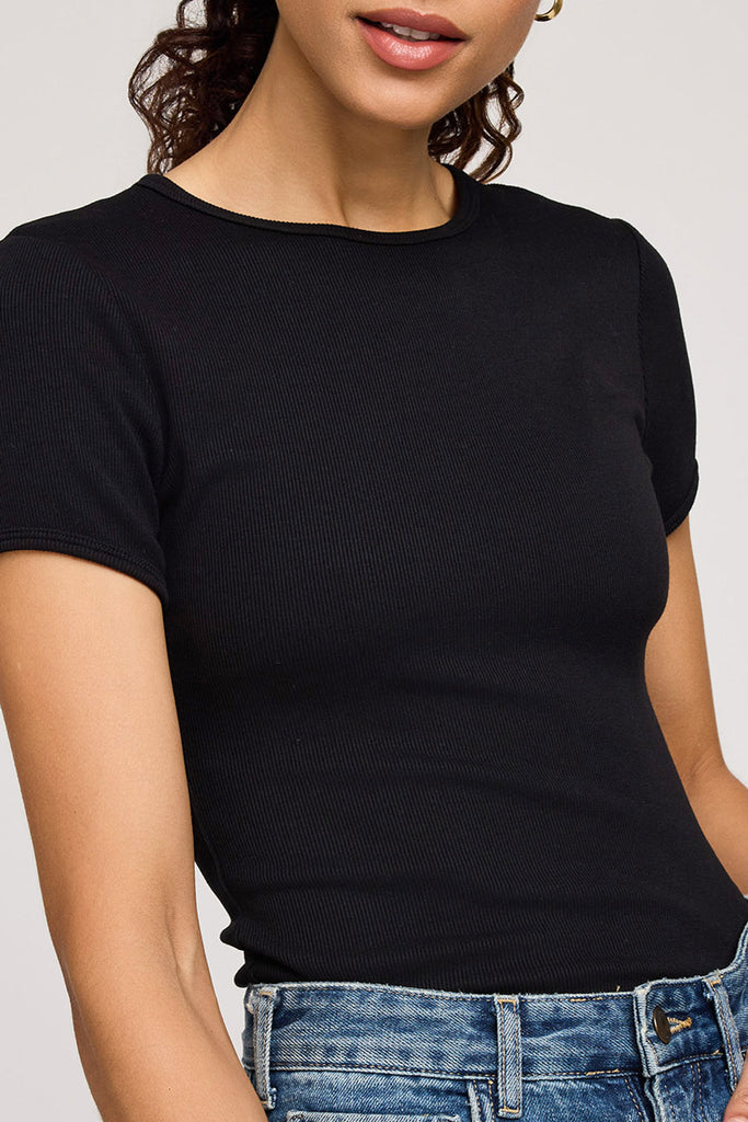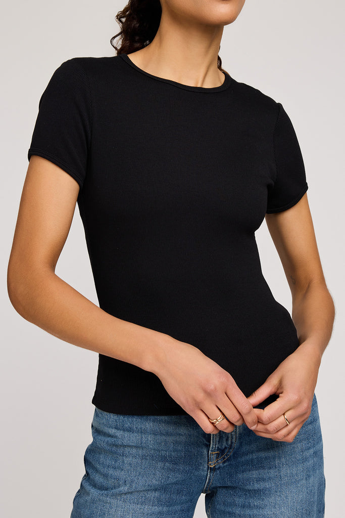 Personify Shopversatile black tee made from a stretchy ribbed fabric that hugs the body. tee has a form-fitting silhouette and features a crew neckline and binding detail at the sleeve hem. easy to wear tee makes a great basic or a perfect base layer to wear under a cardigan or jumpsuit. pair with the greer pants for a cute lounge wear set.