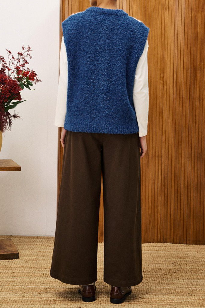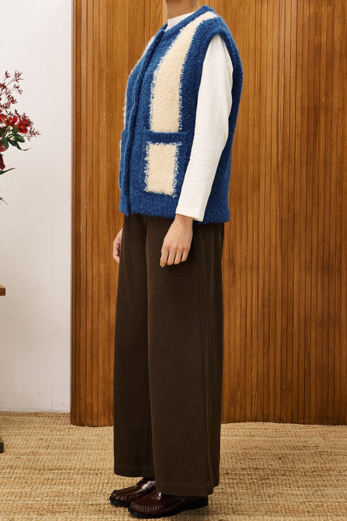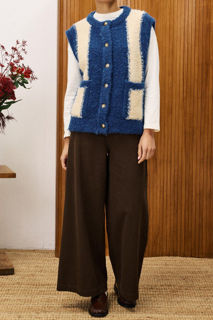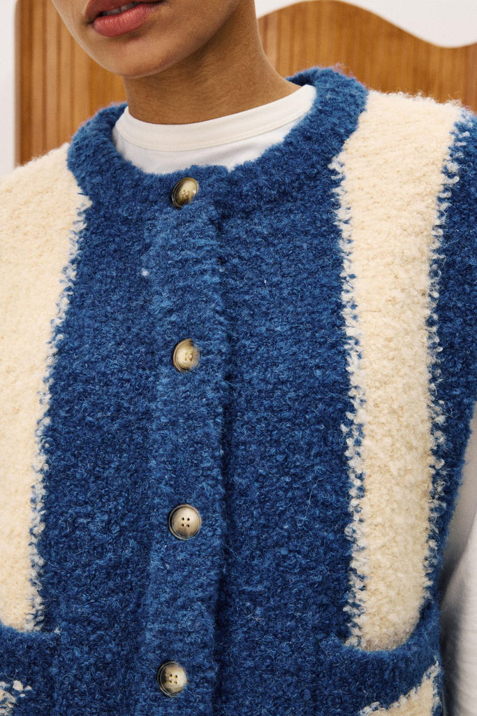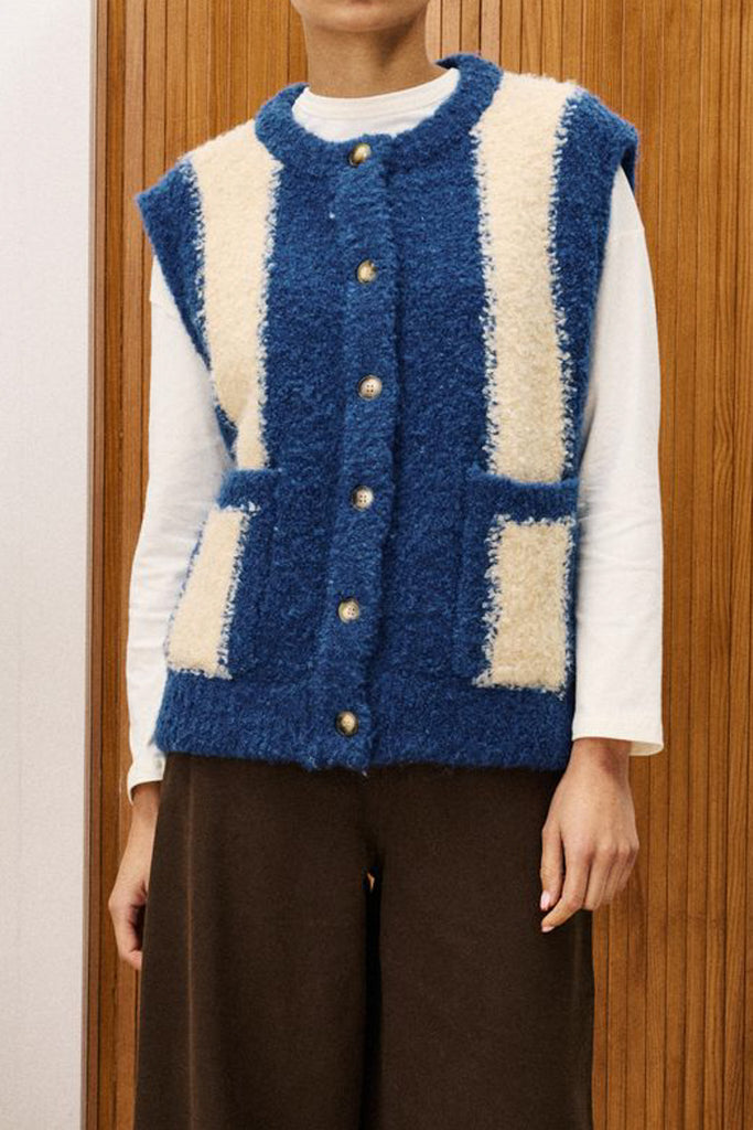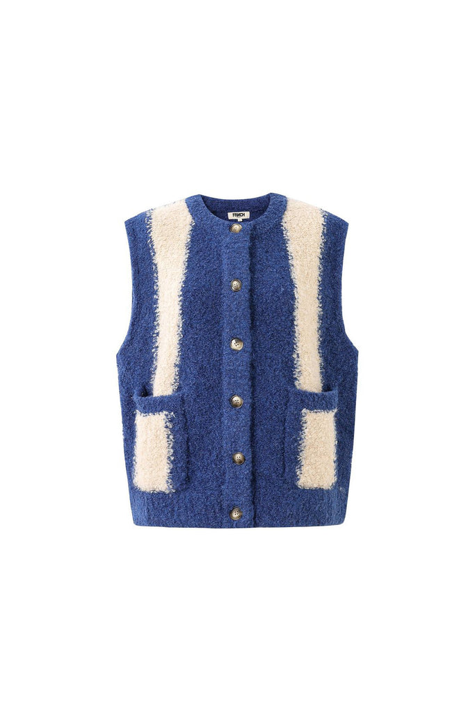 Personify Shopspecial knit sweater vest in soft navy blue and cream. soft and fluffy looped knit vest features a crew neckline, button front, two front pockets, and a straight fit. sweater makes a cozy layer to bring into the fall and winter. vest runs true to size.