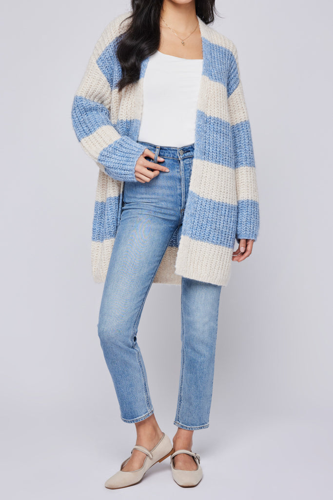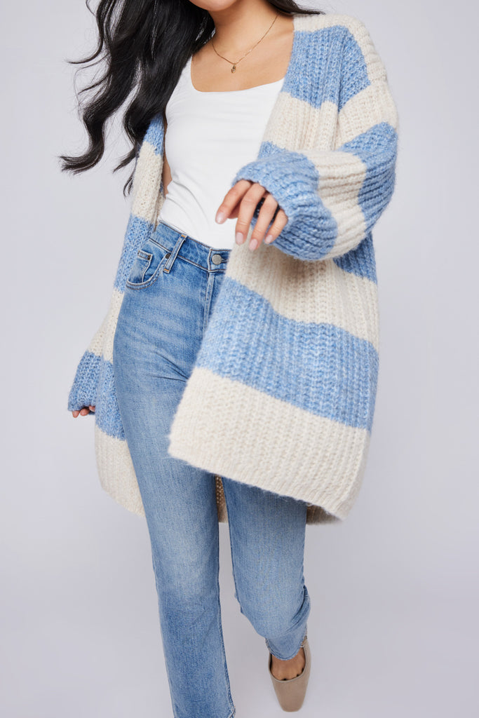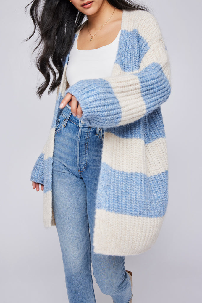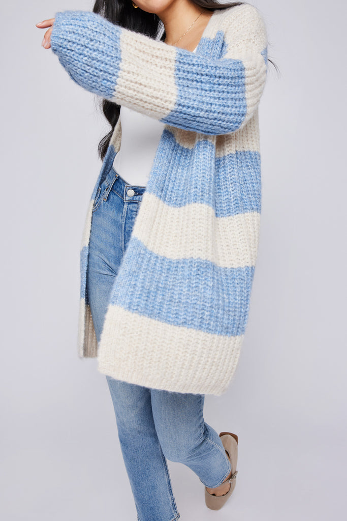 Personify Shopoversized open cardigan in fresh feeling cream and sky blue stripes. made from a lofty yarn, this ultra cozy sweater features a ribbed knit fabrication, open front, roomy long sleeves, and an extra long length. this effortless sweater is the perfect layering/transitional piece to wear as the seasons change.