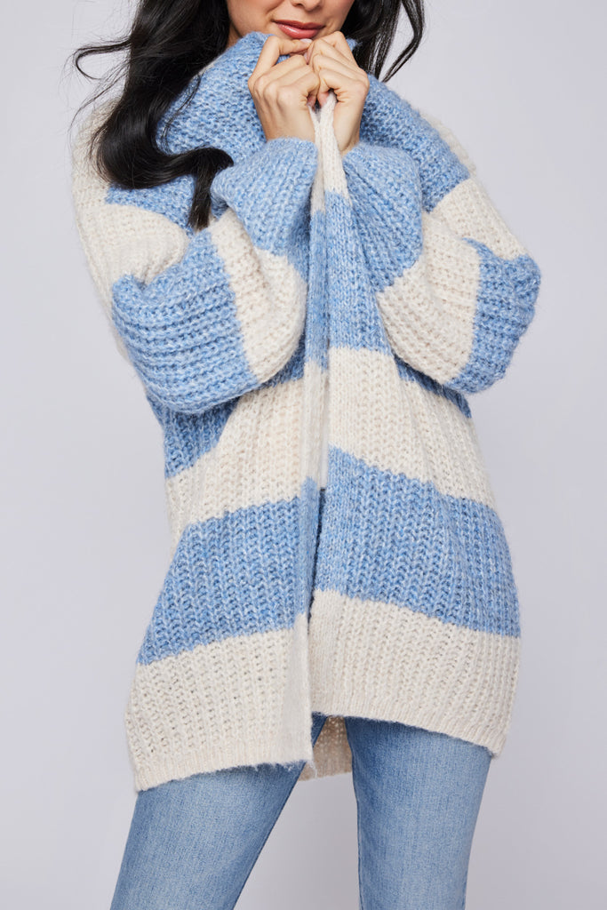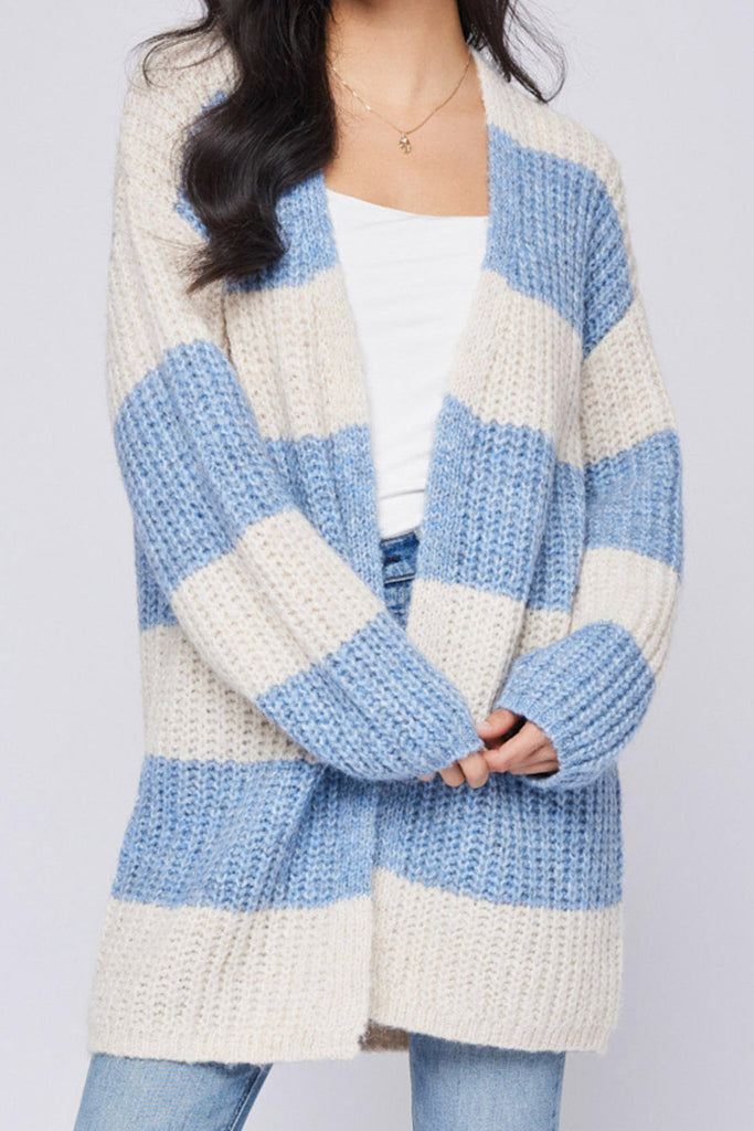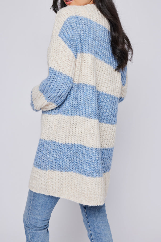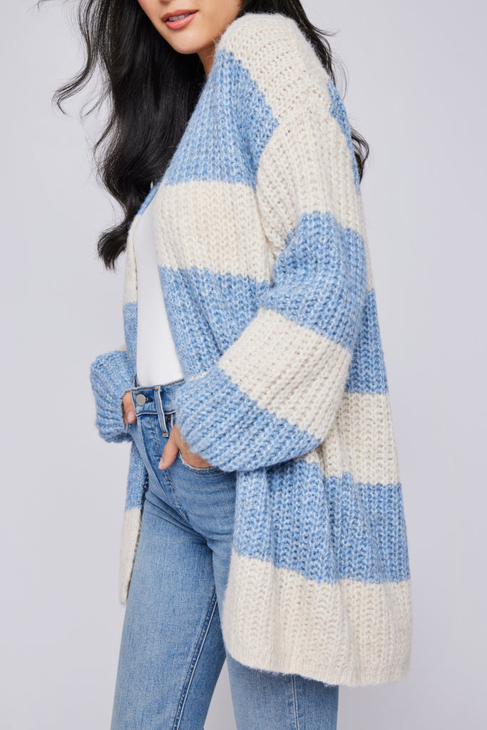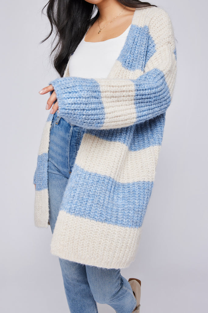 Personify Shopoversized open cardigan in fresh feeling cream and sky blue stripes. made from a lofty yarn, this ultra cozy sweater features a ribbed knit fabrication, open front, roomy long sleeves, and an extra long length. this effortless sweater is the perfect layering/transitional piece to wear as the seasons change.