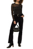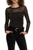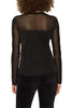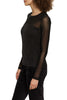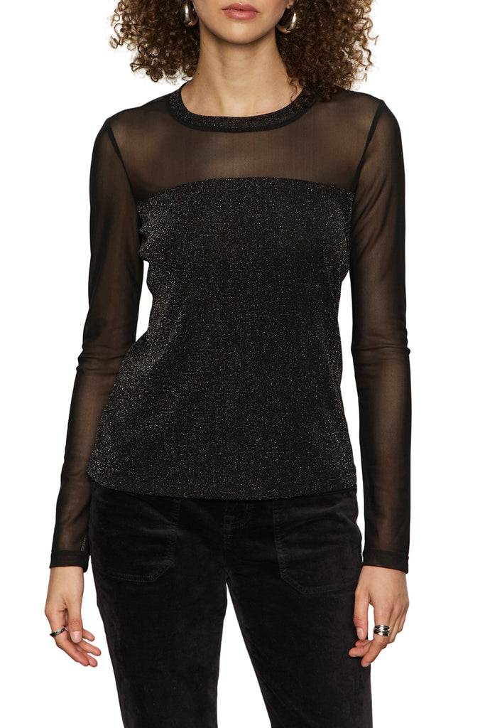 Personify Shopblack long sleeve mesh top with a sparkly bodice. lightweight top features a crew neckline, sheer shoulders and sleeves, a shimmery bodice, and a fitted silhouette. top is subtly festive and can be styled casually with jeans or dressed up with black pants or a skirt.