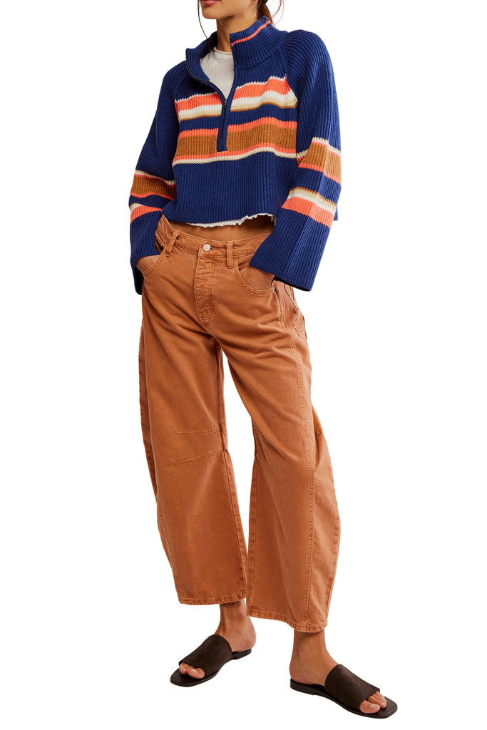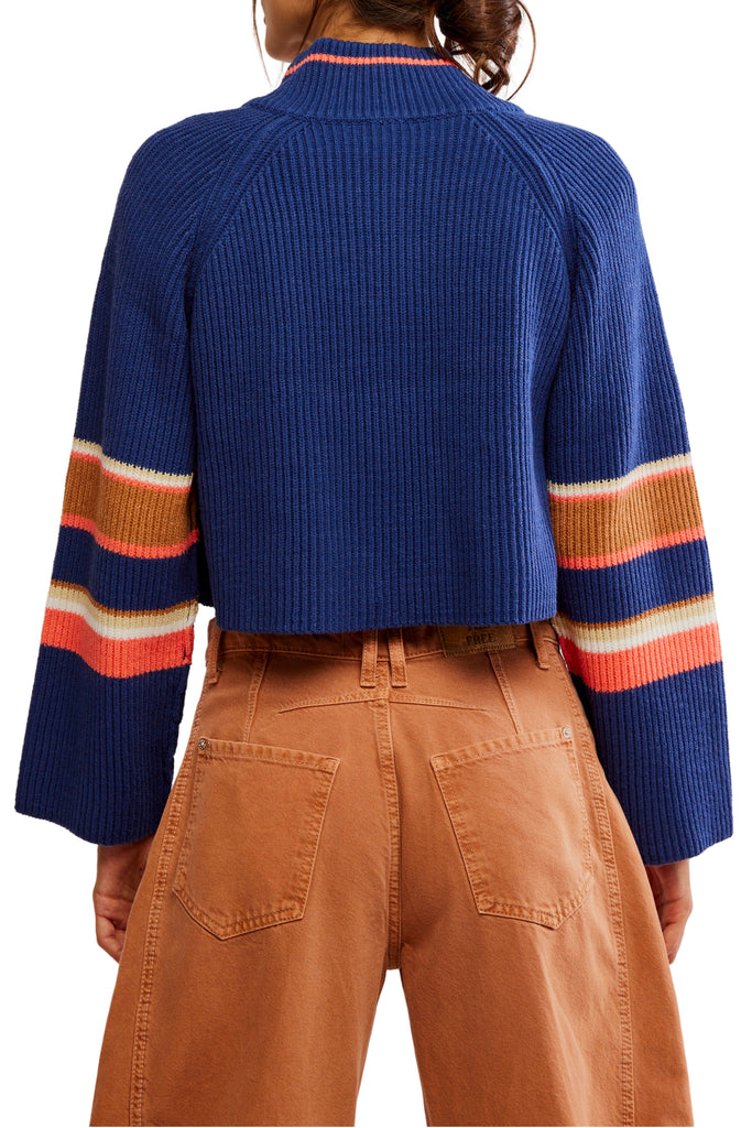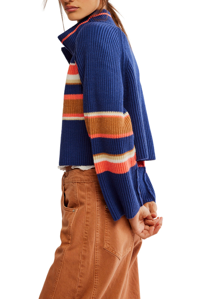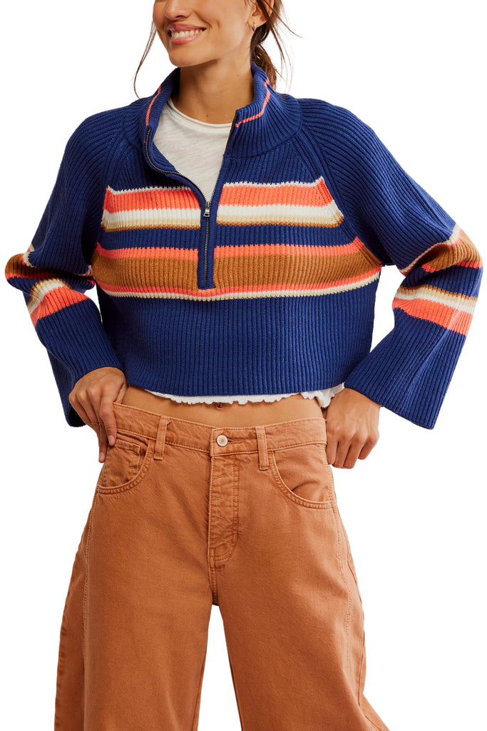 Personify Shopfree people half zip pullover sweater in soft navy blue with stripes in tan, white, and coral. soft ribbed knit sweater has a boxy, slightly cropped fit and features a high neckline, half zip closure, slouchy raglan sleeves, and classic pullover styling. heavy sweater has a casual, nautical vibe that looks great with jeans or white pants.