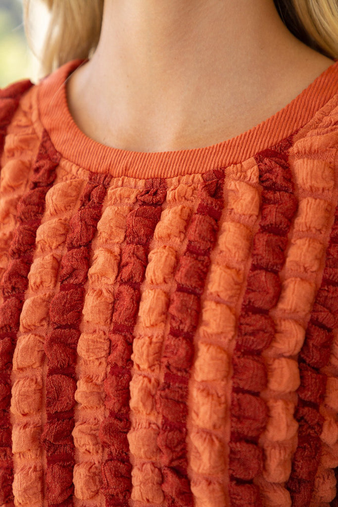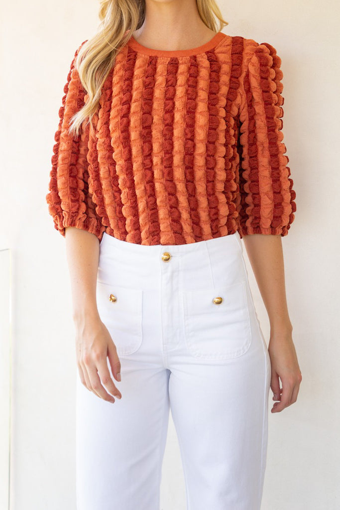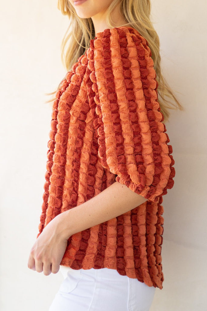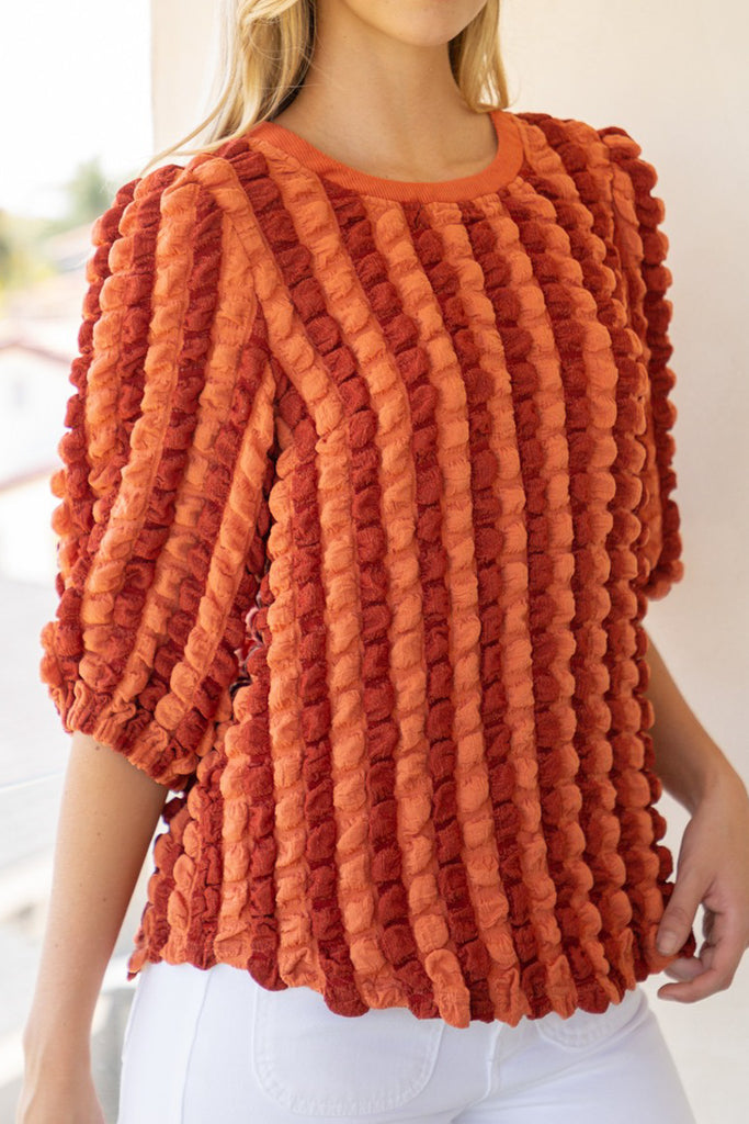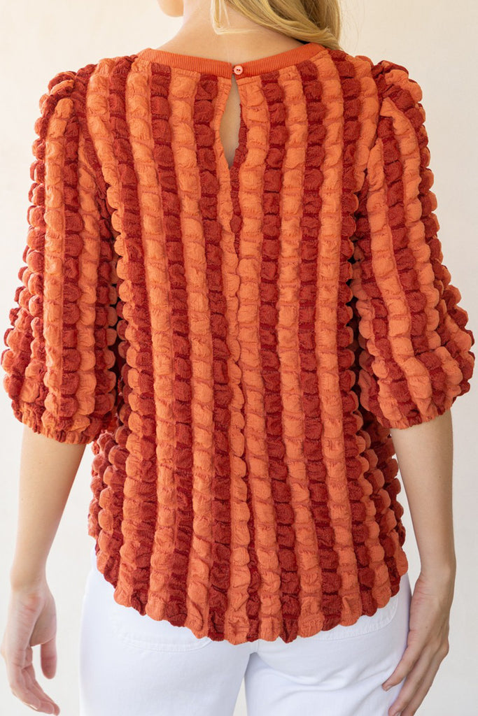 Personify Shopunique top with textured and puffy red and orange vertical stripes. colorful top is full length and features a velvety ribbed crew neckline, keyhole button closure on back, three-quarter length balloon sleeves, and a slightly longer back hem. top runs slightly big.
