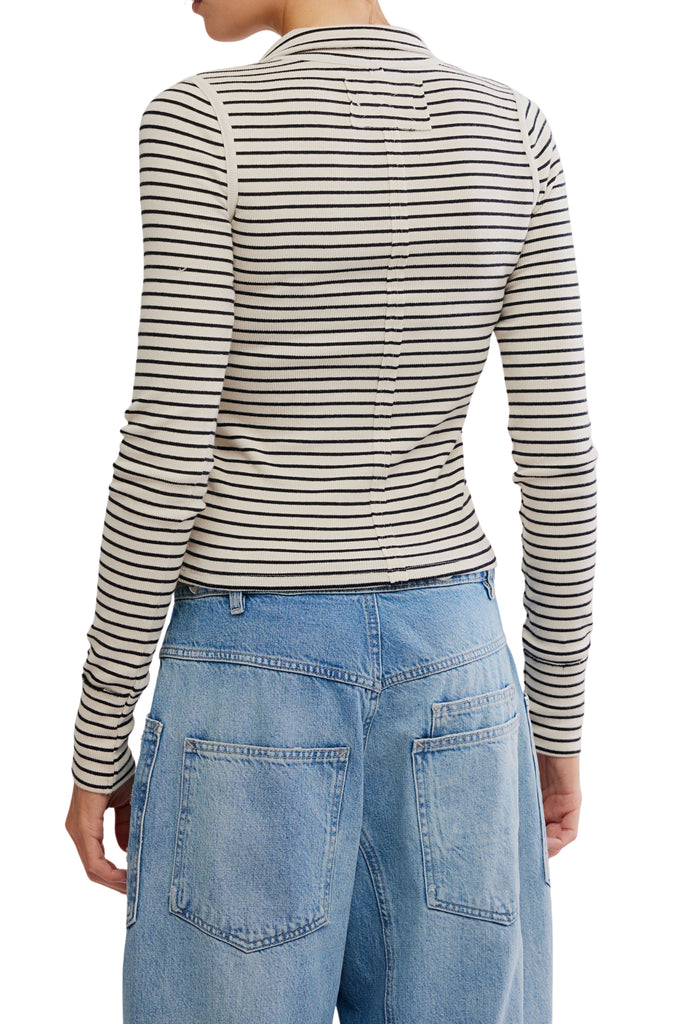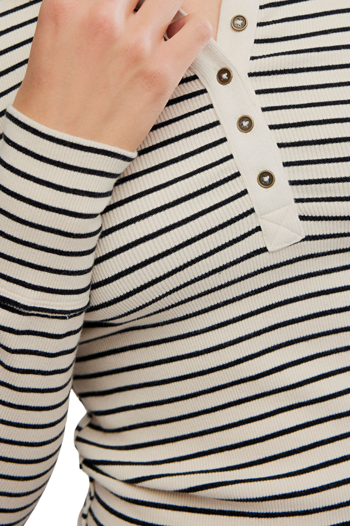Personify Shopfree people fitted long sleeve henley in off white and black stripes. stretchy, ribbed knit top features a mock neckline, half button front, and a form-fitting silhouette. comfortable full length top can be worn on its own with a skirt or jeans or worn under your favorite overalls or sweater vest.