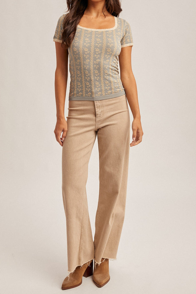 Personify Shopstretchy seamless grey tee with delicate lace trim. form-fitting top features a square neckline, short sleeves, and a feminine stripe/floral design. casual top makes a great base layer, but it can also be styled on its own with jeans, a skirt, or under overalls.