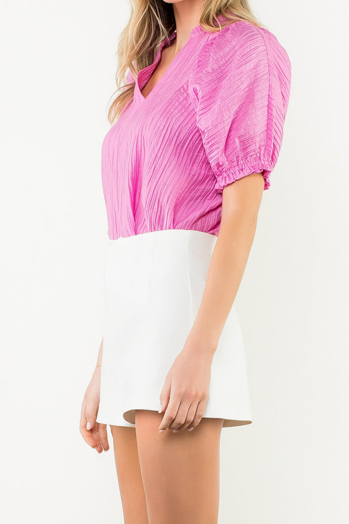 Personify Shopcute blouse in lightly textured purple pink. blouse features a ruffled v neckline, short puff sleeves, and a full length. top runs slightly big. versatile top can easily be styled with black pants or jeans for professional or casual wear.