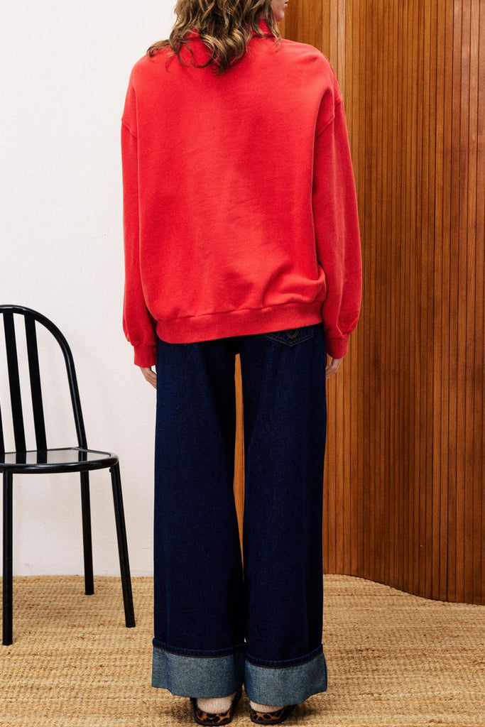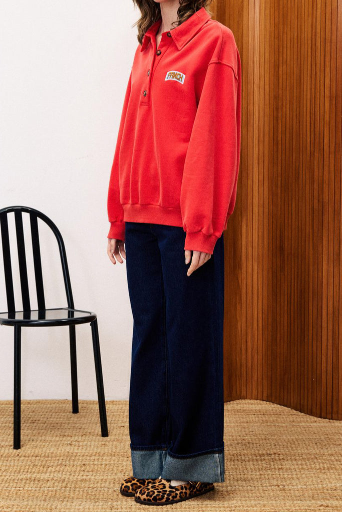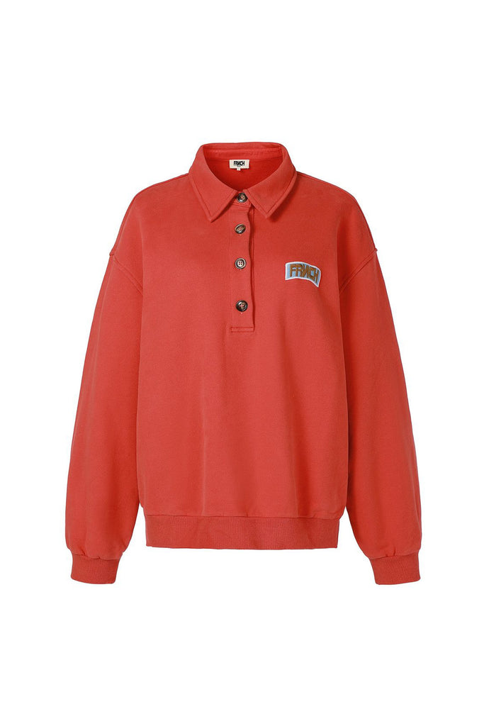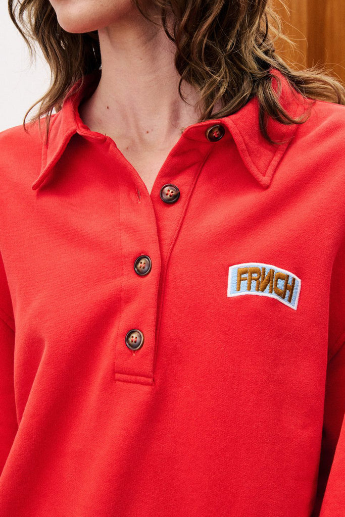 Personify Shopbold vermillion red polo-style sweatshirt with embroidered frnch logo in sky blue and coppery brown. relaxed and slightly slouchy sweatshirt features a half button front with small collar, dropped shoulders, and roomy long sleeves. cute pullover has a sporty vibe that is perfect for fall.